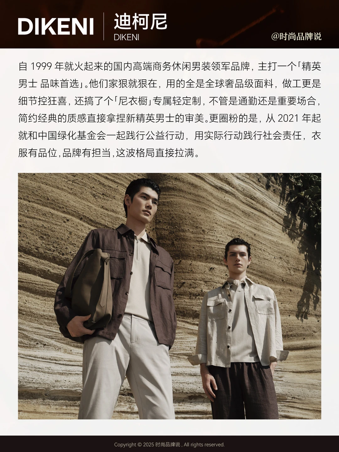DIKENI迪柯尼创立于 1999 年,是中国商务休闲高端男装领军品牌,秉持「精英男士 品味首选」主张。品牌甄选全球奢品级面料,以匠心工艺打磨,首创「尼衣橱」专属形象轻定制服务,凭简约、经典、质感的内核引领新精英男士着装理念。2021 年起携手中国绿化基金会推进阿拉善植树行动,践行社会责任,深化「穿迪柯尼,有品位,更有担当」的品牌精神。