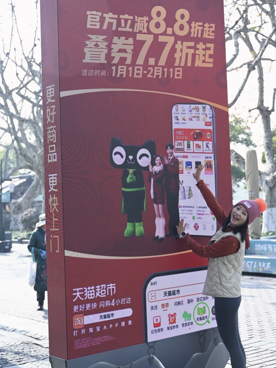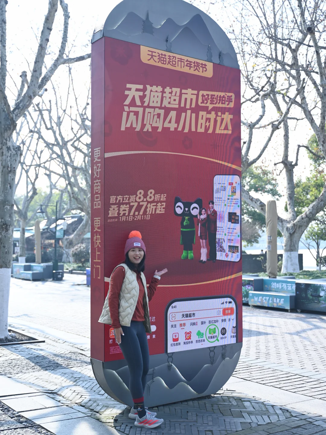 跑到西湖边银泰in77这边的时候,广告牌都换上了年味很足的广告。今年买年货可以用天猫超市闪购4小时达,大把时间可以慢慢挑选。
