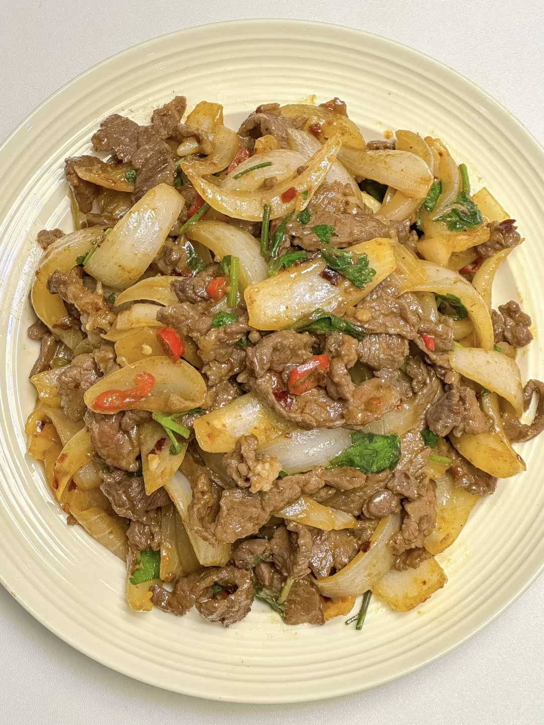 又香又嫩的洋葱炒牛肉🧅嘎嘎下饭巨巨巨好吃!!做法简单,牛肉滑嫩入味,洋葱香甜可口,配白米饭可香惨了😋 🌟准备食材🌟 牛肉、洋葱、香菜 🌟做法🌟 1️⃣牛肉切片加一勺生抽、一勺蚝油、一勺淀粉、一勺食用油抓匀腌制15分钟 2️⃣锅中油热倒入牛肉炒变色盛出备用 3️⃣另起锅油热加入洋葱小米椒爆香,倒入炒好的牛肉,加适量辣椒面和孜然粉翻炒,最后加一把香菜翻炒均匀即可出锅