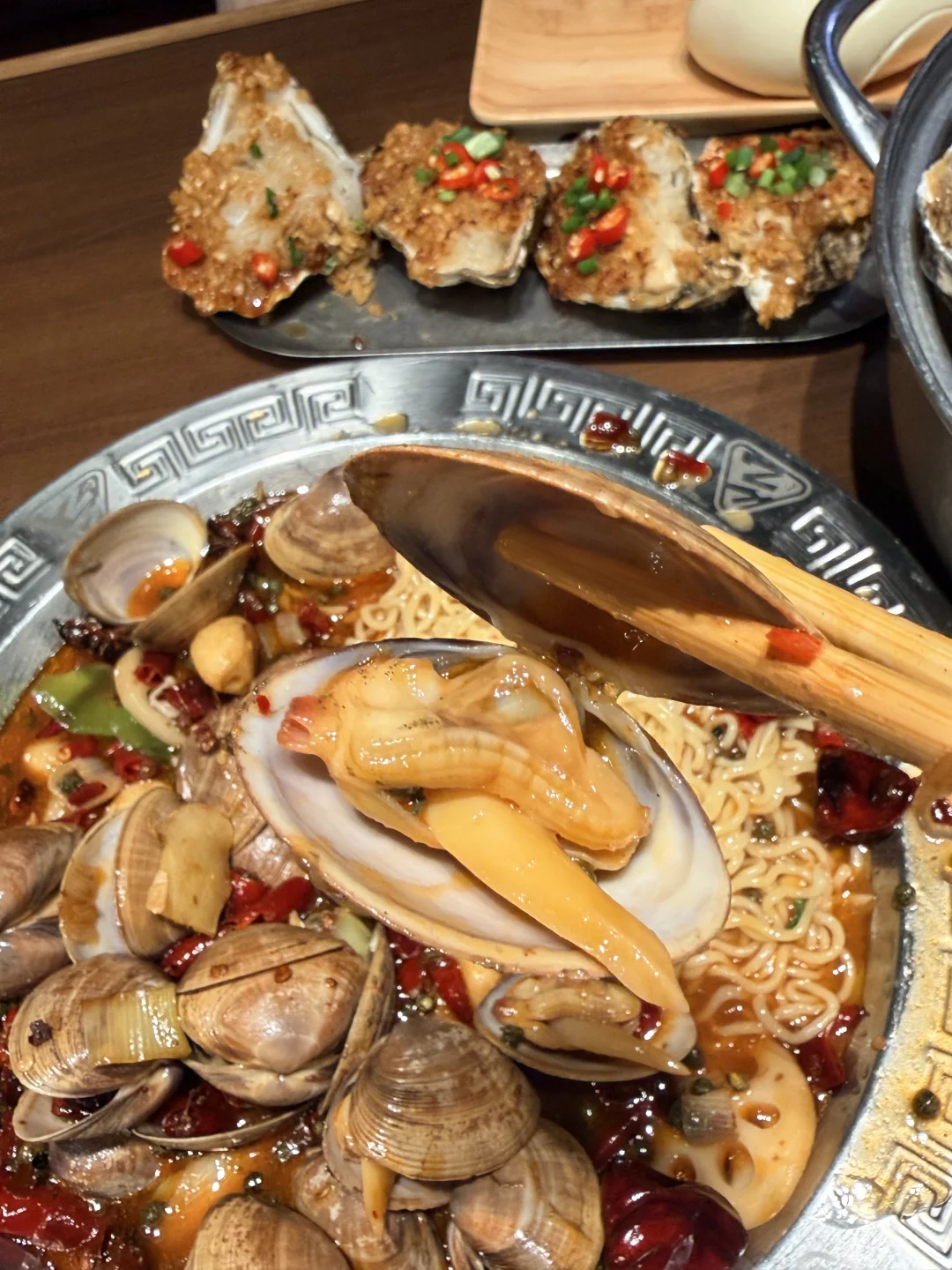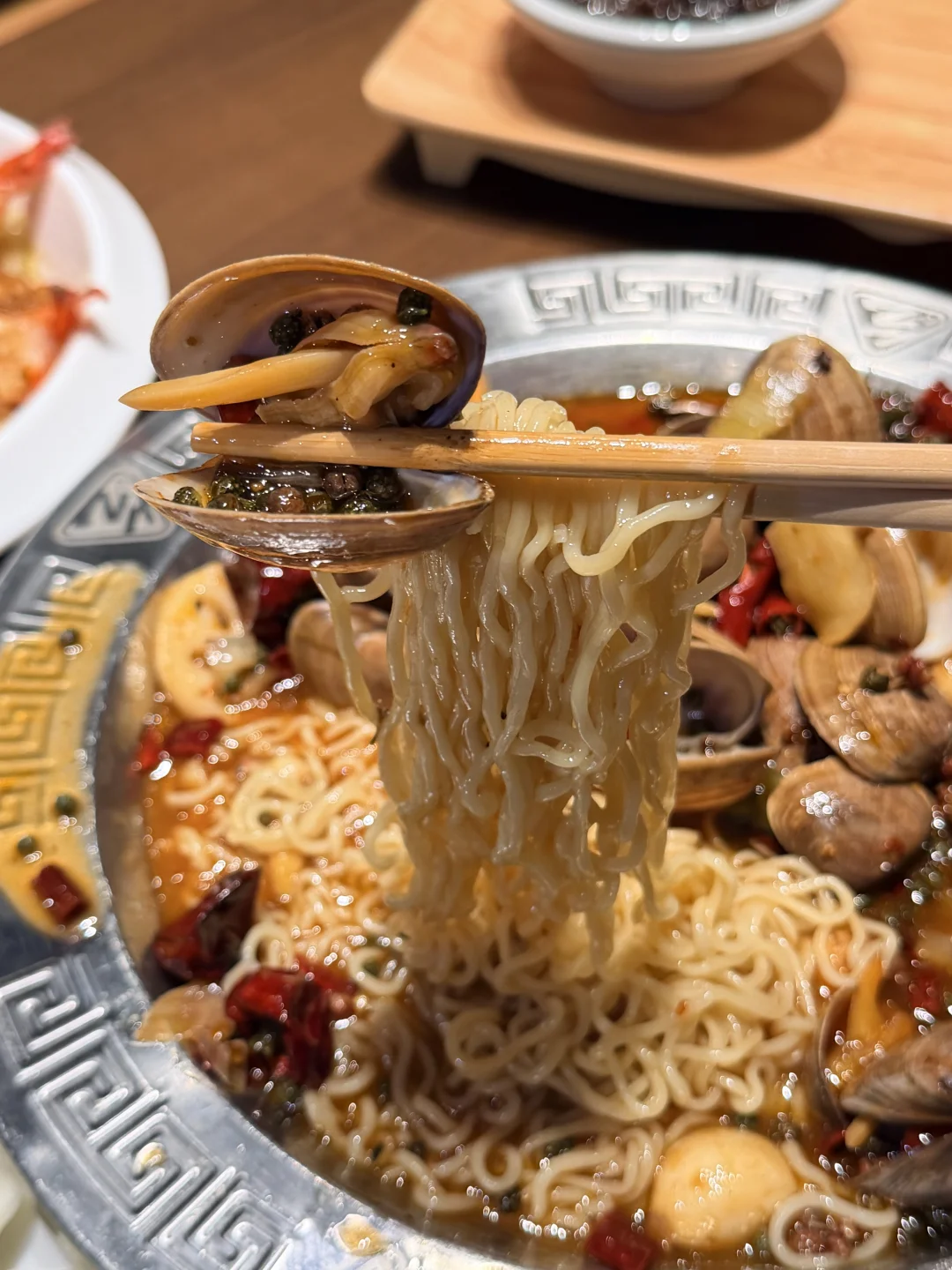 ❶甜麻肥蛤🔥真的是蛤蜊天才做法!特制的甜麻汁浸透了肥嫩的蛤蜊,入口先甜后麻,真的很上头!我自己可以吃大半盆!还有灵魂的辛拉面拌入,每一口都伴着甜麻的口感,是我每次的必点菜!