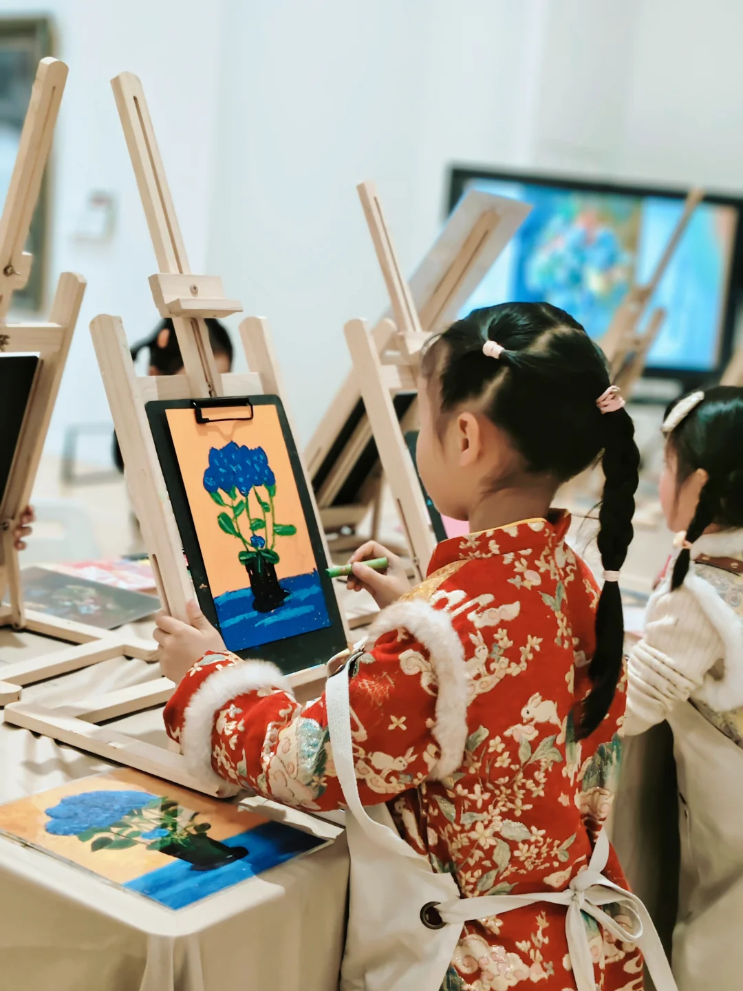 “艺术魔法书”工作坊,学混色技巧,画花卉生长四格翻页动画,记录生命轮回。用粘土捏出喜爱的花🌸,小丸子都很喜欢。