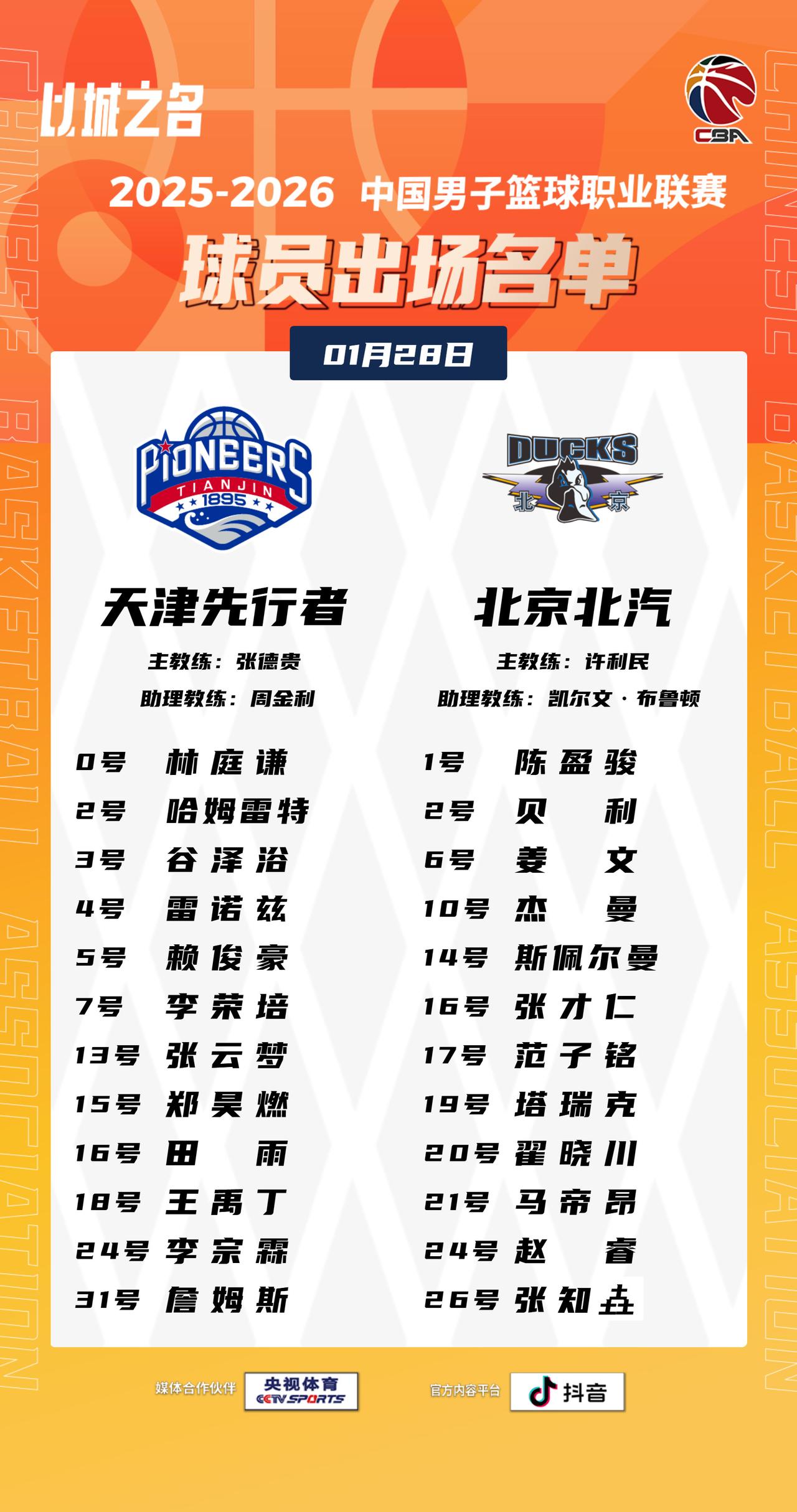 【大名单出炉】2025-2026赛季CBA联赛常规赛第二十一轮今晚开打,2场比赛将在19:35同时跳球,敬请期待!