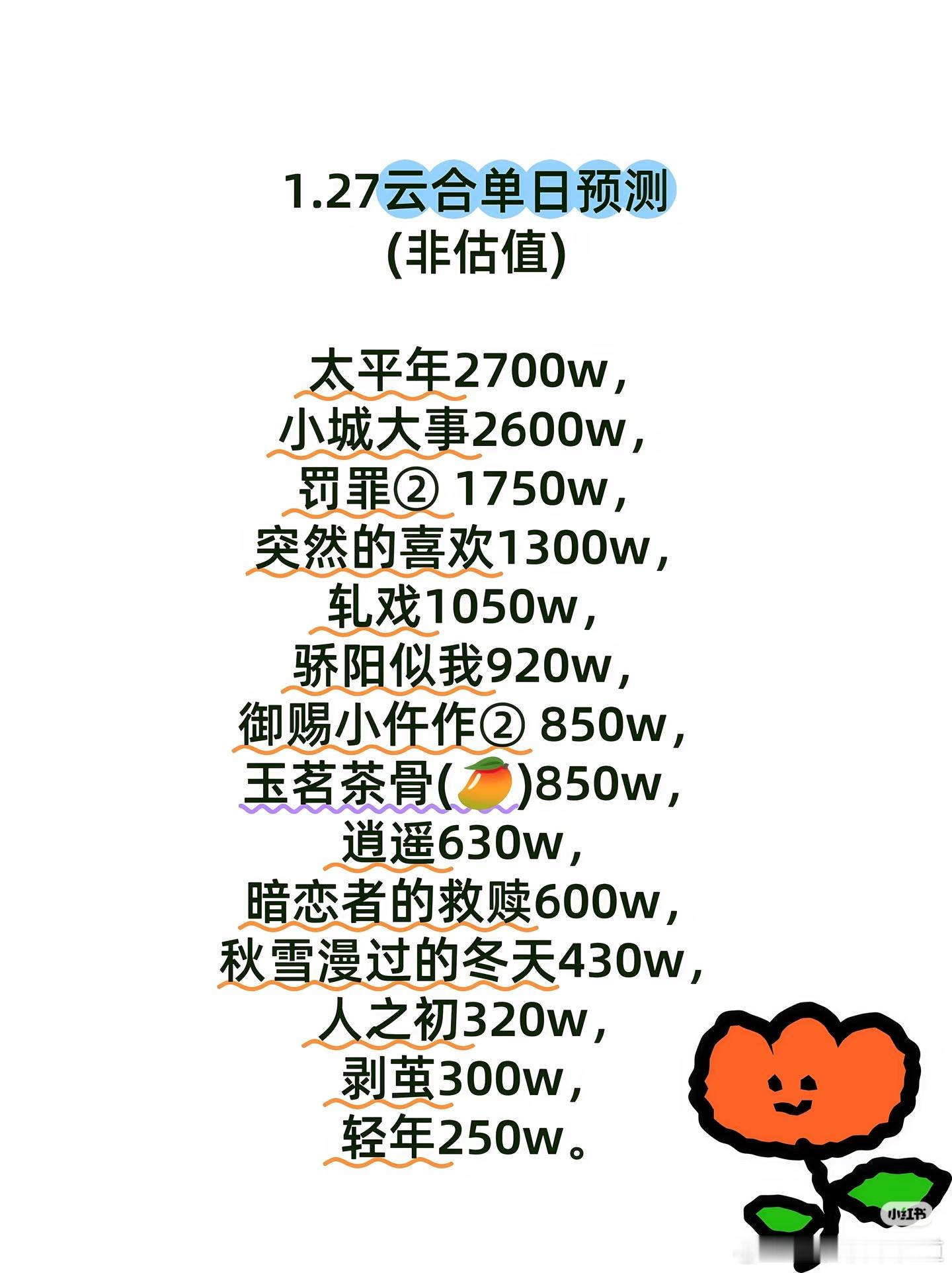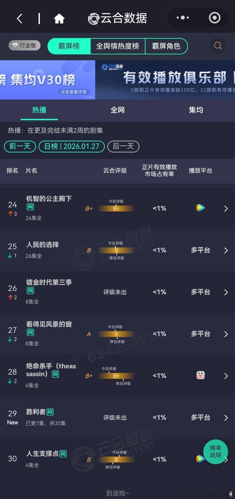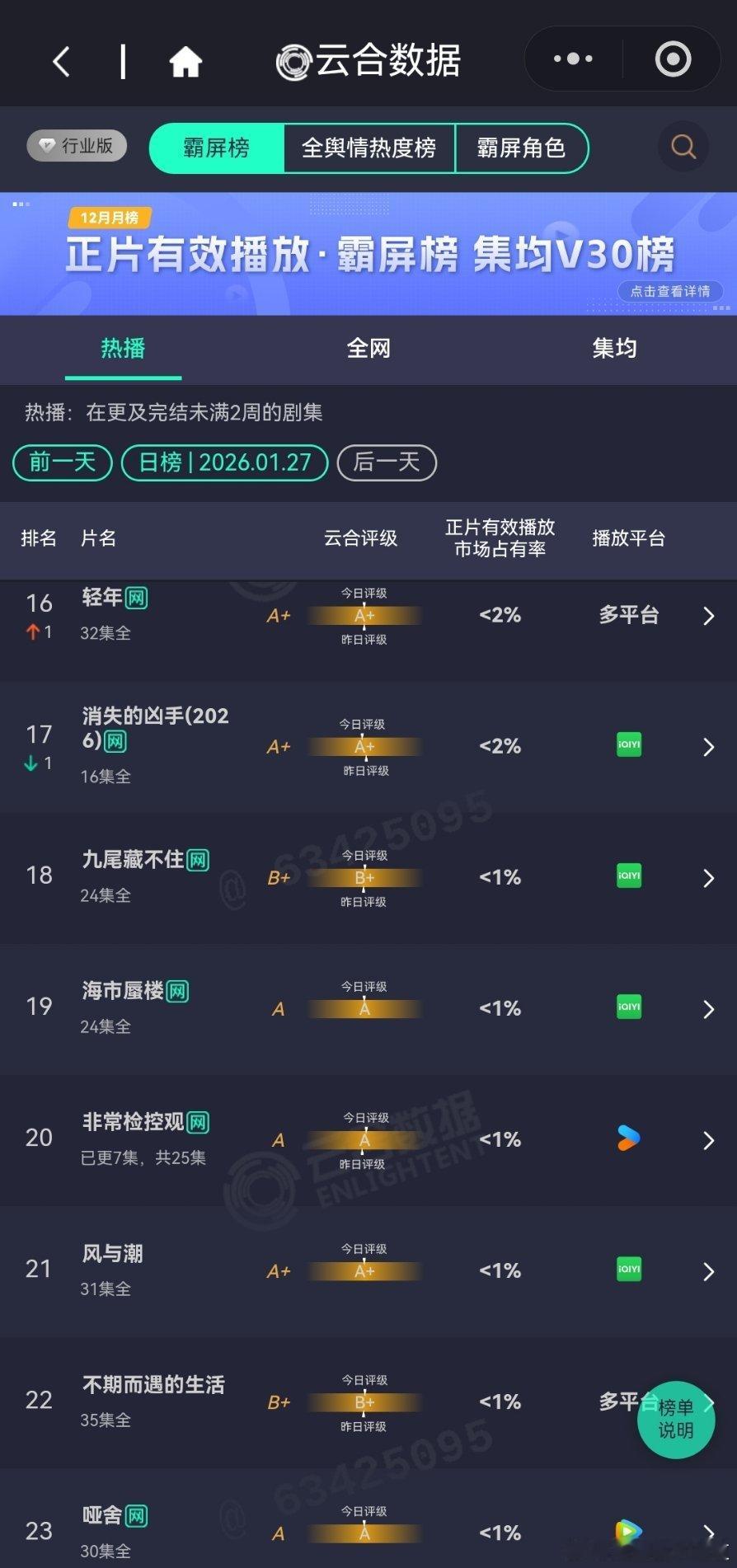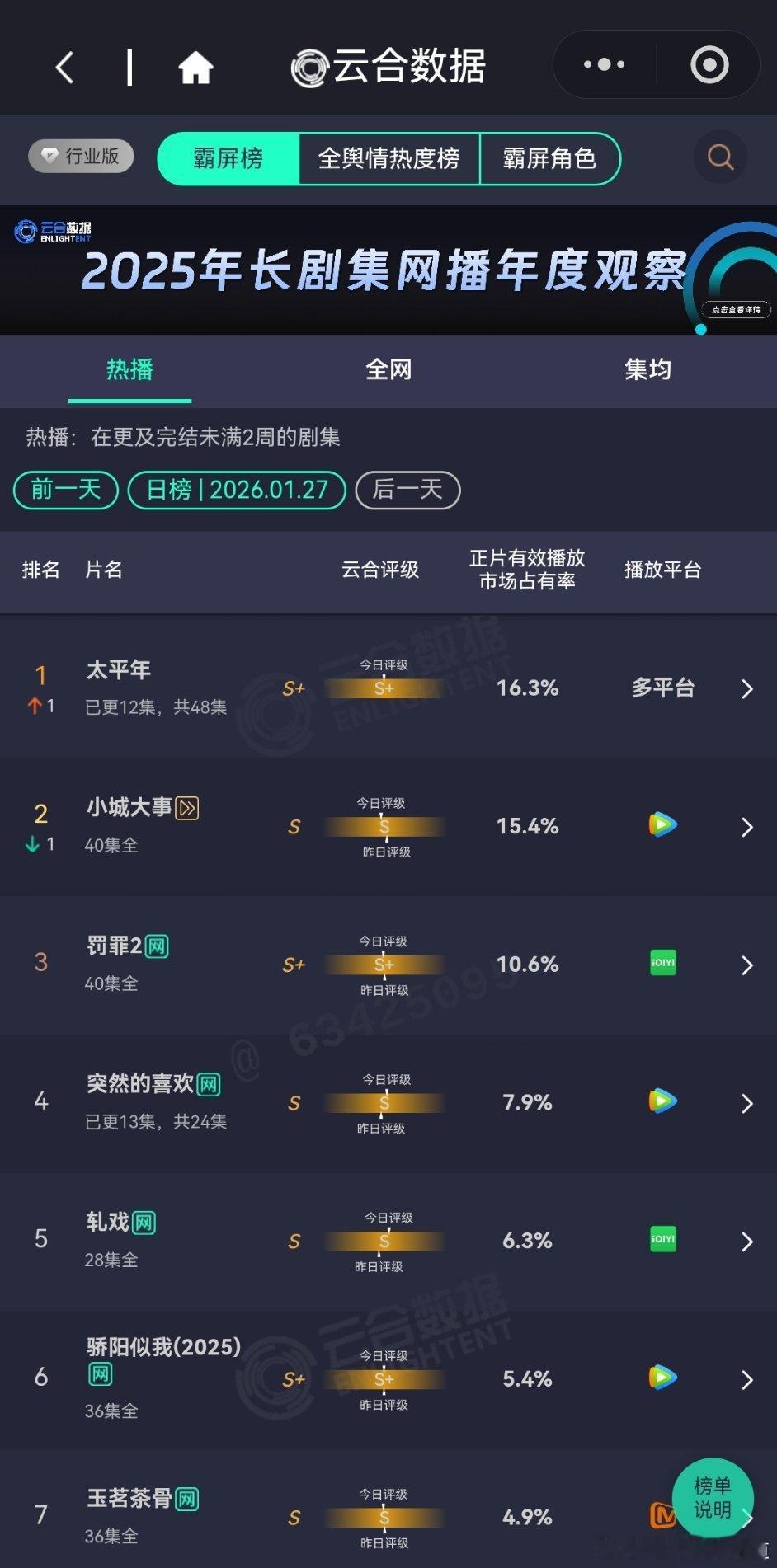 2026年1月27日云合播放占比云合 太平年云合16.3%太平年云合登顶了,评级S+小城大事15.4%三日游结束了,评级还在降,太可怕了。罚罪2 10.6%集均破3000万了。突然的喜欢7.9%轧戏6.3%