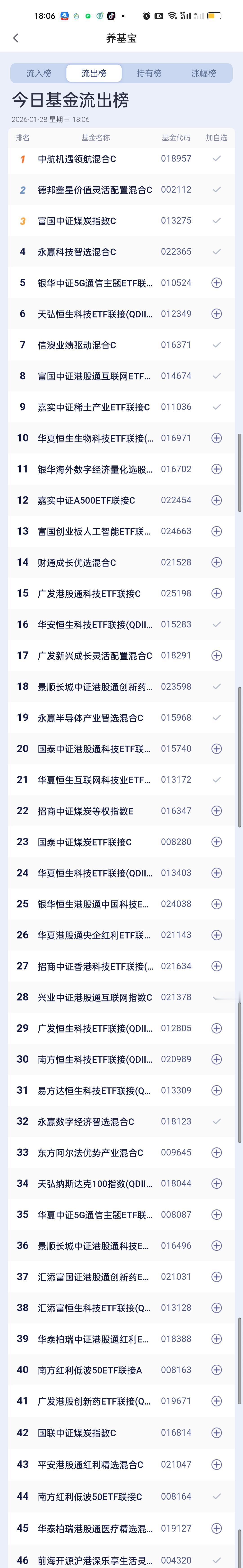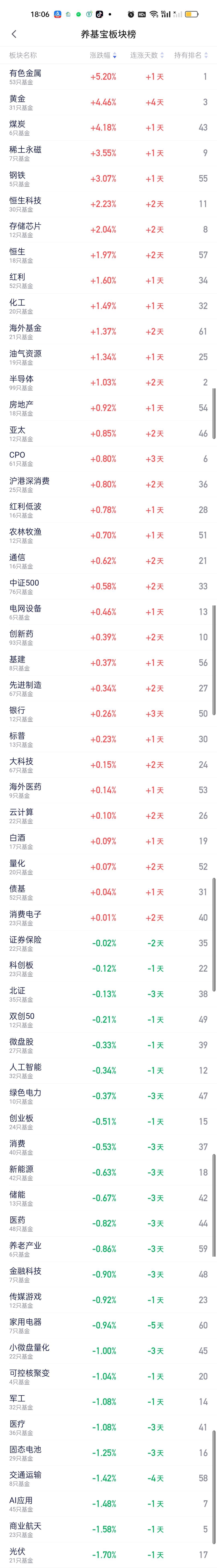 今日基金加仓榜,减仓榜,板块榜以及估值榜已全部更新完毕。前海开源金银珠宝,华夏黄金ETF联接,国泰有色矿业ETF联接位居加仓榜前三,中航机遇领航,德邦鑫星价值,富国中证煤炭指数位居减仓榜前三。 板块榜方面,涨幅居前的是有色金属,黄金,煤炭,稀土永磁,钢铁,恒科,存储芯片,恒生指数,红利,化工,油气资源。跌幅榜靠前的是机器人,脑机接口,光伏,商业航天,AI应用,交通运输,固态电池,医疗,军工,可控核聚变。