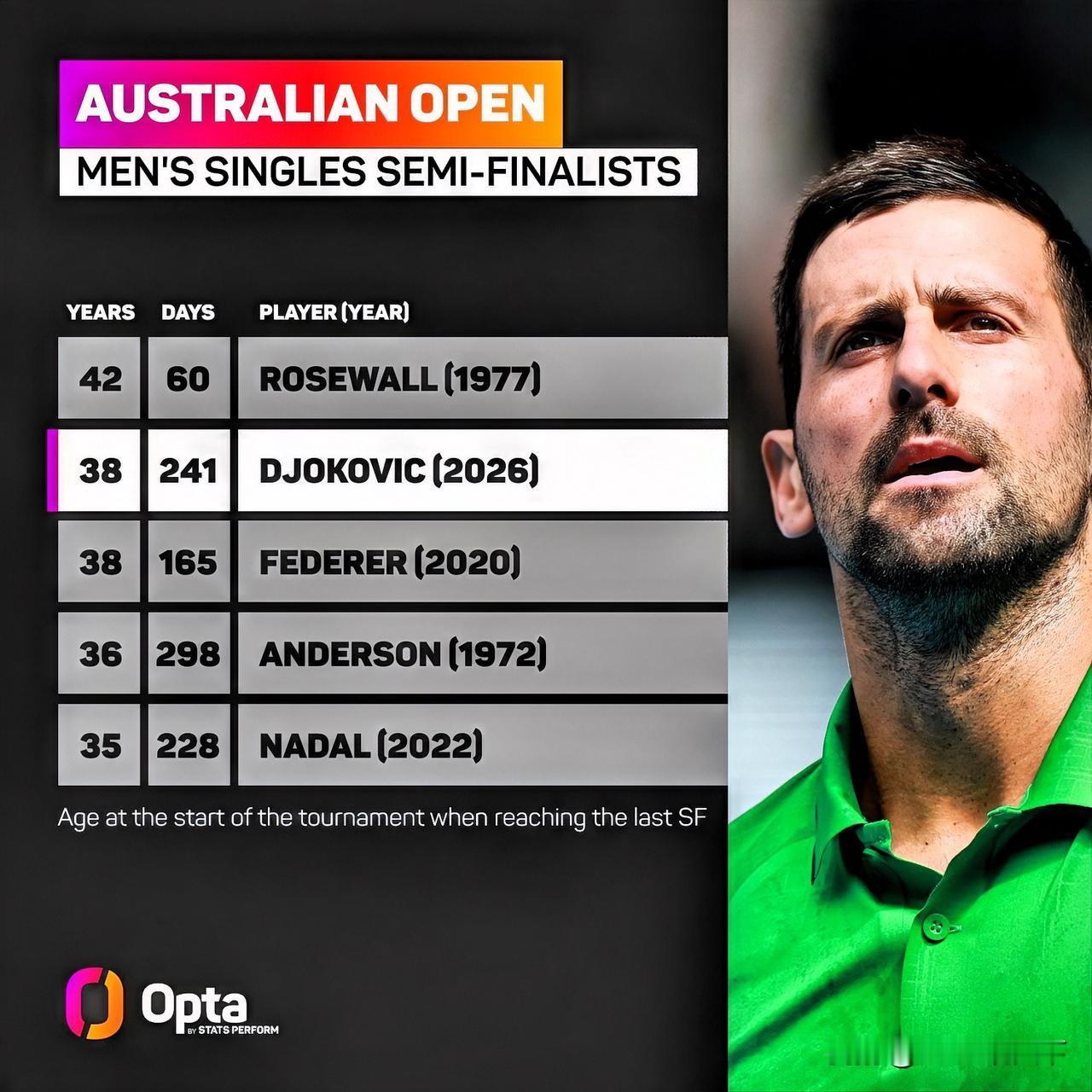 德约科维奇再次闯进澳网半决赛,继续冲击职业生涯第25座大满贯冠军🏆! 随着德约科维奇晋级2026澳网半决赛,他成为公开赛时代澳网男单半决赛选手中第二年长的,仅比1976年和1977年的肯·罗斯沃尔年轻(超过了罗杰·费德勒在2020年的最后一次)。 德约科维奇职业生涯曾在澳网收获10座大满贯冠军🏆:2008年、2011年、2012年、2013年、2015年、2016年、2019年、2020年、2021年、2023年。 奇迹还未结束,期待德约科维奇的第十一座澳网冠军🏆!2026澳网 德约科维奇 网球 辛纳