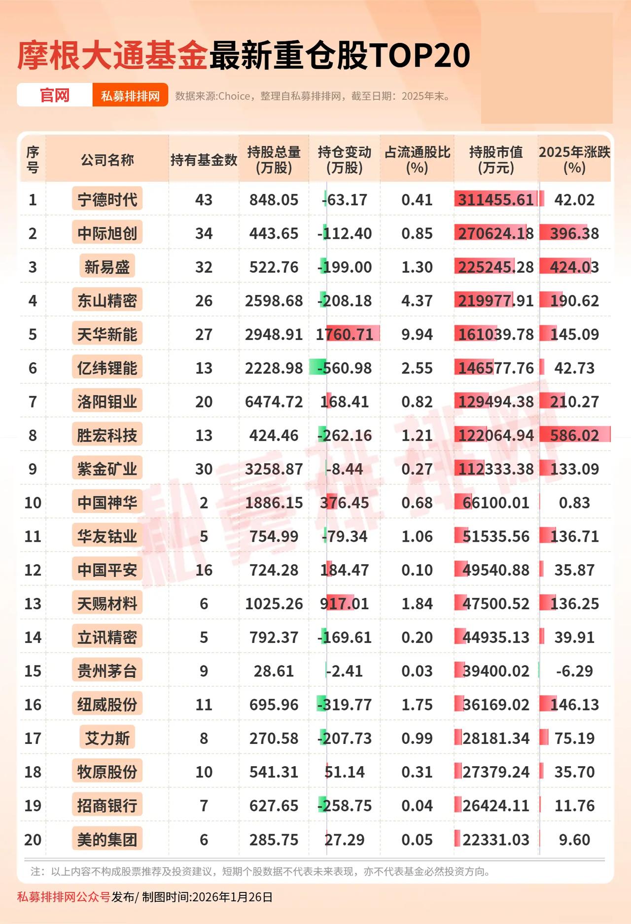 摩根大通基金最新持股明细(2025年四季度) (向右滑动图片查看完整持仓) 摩根大通(俗称“小摩”)总部位于美国纽约,是一家综合性金融服务集团,业务涵盖个人日常支付、企业跨国并购、初创企业融资、政府债务管理、全球资产配置等多个维度。 截至2025年四季度末,摩根大通基金资产规模达2405.72亿元,旗下基金在四季度末持有215只个股,持有股票市值约为847.31亿元。 摩根大通基金持仓明细显示,持股市值最多的20家公司,均在2亿以上。 从2025年涨跌幅来看,仅有1只个股出现微跌,其余19只个股的均出现不同程度的涨幅,年度涨幅在100%以上的个股有10只。