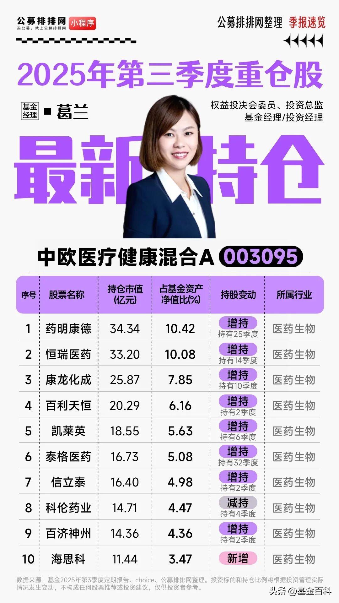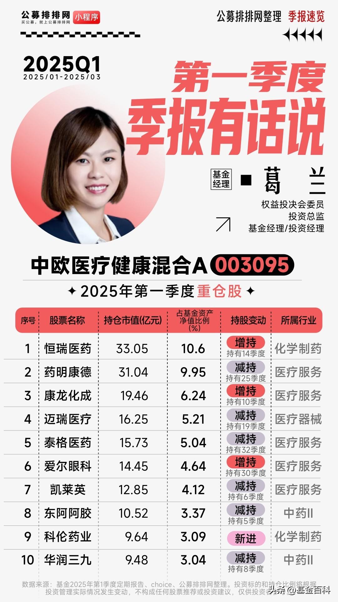 葛兰2025年最新持仓公布!增持创新药 葛兰是美国西北大学生物医学工程博士,现任中欧基金管理有限公司知名基金经理,以深耕医药健康领域著称。 私募排排网大佬持仓数据显示,近日,由中欧基金葛兰与赵磊共同管理的中欧医疗健康混合披露2025年四季报。 截至2025年12月末,葛兰旗下在管基金总规模由去年三季度末的435.44亿元降至353.89亿元。葛兰前十大持仓占比从第1季度的55.30%上升4季度至64.20%,对医药股的持仓进一步集中,显示了其坚定的医药赛道投资风格。 葛兰在2025年四季报中提到,2025年第四季度,中证医药指数下跌12.7%,表现弱于同期下跌0.2%的沪深300指数。细分板块分化明显,创新产业链在前期大幅上涨后进入调整阶段,医疗器械、生物制品及化学制品板块同样承压,而中药与医药商业等细分领域相对表现稳健。 葛兰表示,2026年第一季度医药板块在宏观环境改善、产业政策支持与创新推进的共振下,有望延续结构性行情。投资机会将主要聚焦于创新药械产业链出海进展与技术迭代,设备器械板块的国产替代进程、消费医疗的需求复苏与困境反转机会也值得关注。中长期看,中国医药产业在全球范围的角色正从跟随向引领蜕变,我们持续看好医药行业的长期投资价值。