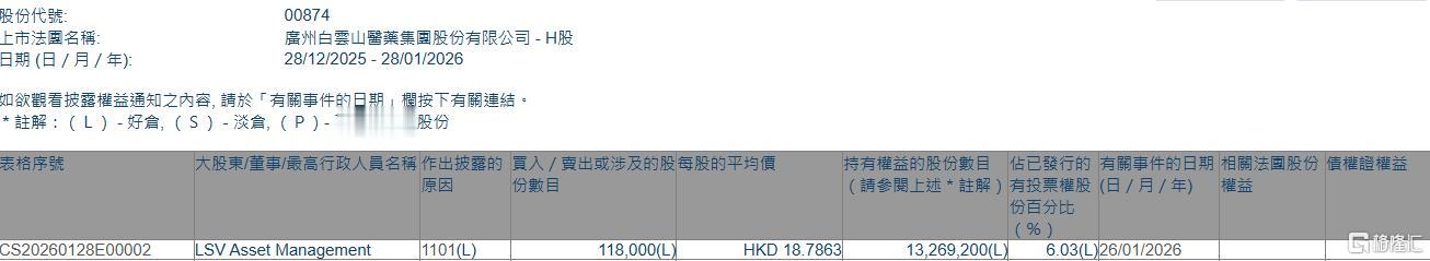 格隆汇1月28日丨根据联交所最新权益披露资料显示,2026年1月26日,白云山(00874.HK)获LSVAssetManagement在场内以每股均价18.7863港元增持11.8万股,涉资约221.68万港元。