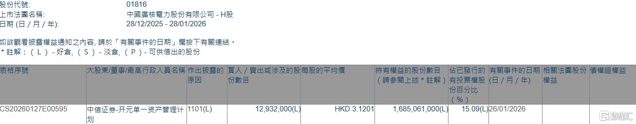 格隆汇1月28日丨根据联交所最新权益披露资料显示,2026年1月26日,中广核电力(01816.HK)获中信证券-开元单一资产管理计划在场内以每股均价3.1201港元增持1293.2万股,涉资约4035万港元。