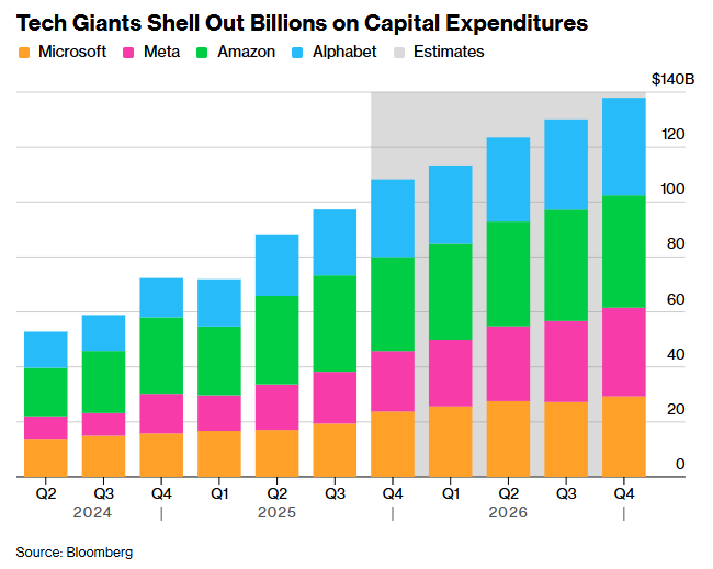 对人工智能(AI)领域巨额投入的回报前景心存疑虑的投资者,将在周三美股盘后微软(MSFT.US)和MetaPlatforms(META.US)发布的财报中获得一些线索。这两家科技巨头是美国AI支出排名前四的企业中率先公布业绩的公司,谷歌(GOOGL.US)和亚马逊(AMZN.US)的财报将于下周出炉。仅2026年一年,这四家公司的资本支出总额预计将达到约5050亿美元,高于2025年估计的约3660亿美元。随着华尔街日益担忧所有这些AI支出能否产生相匹配的利润,投资者正将如此巨额的支出视为潜在风险。