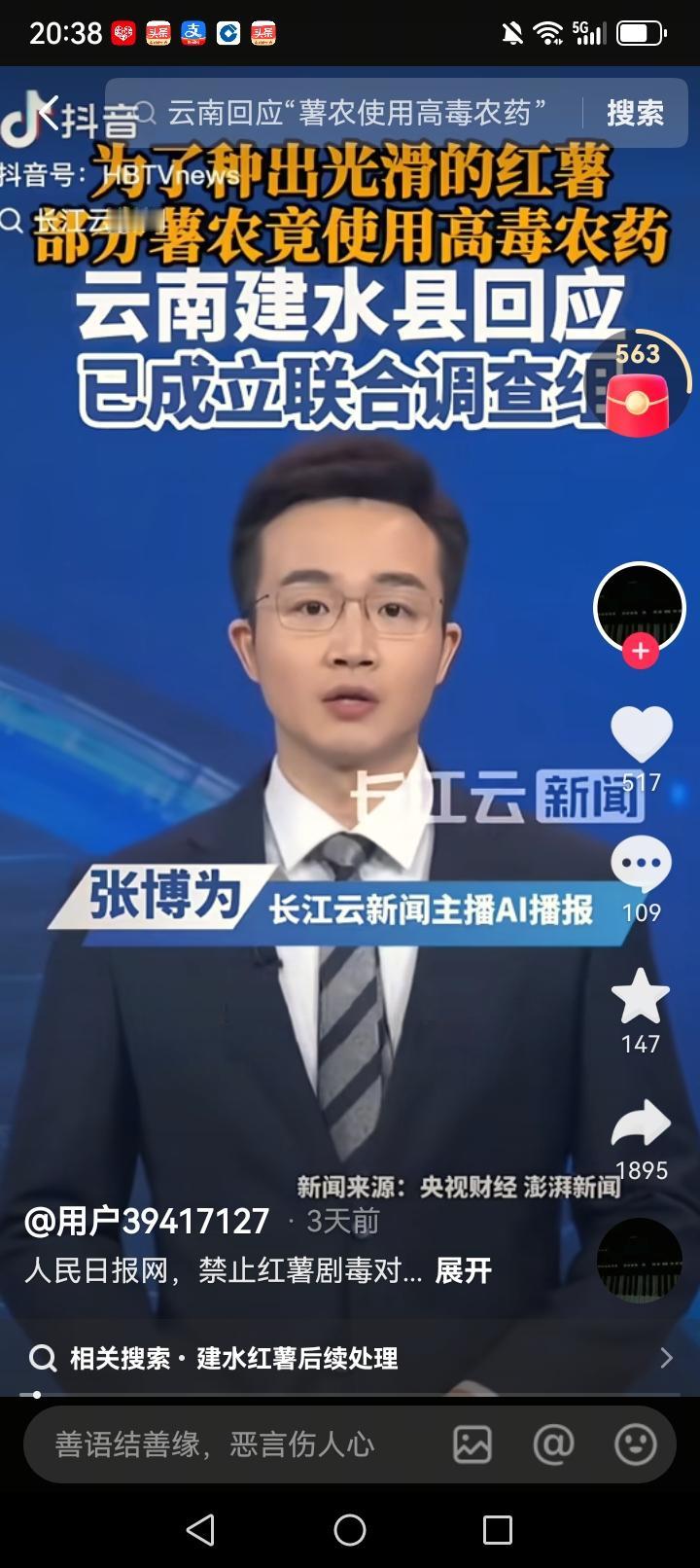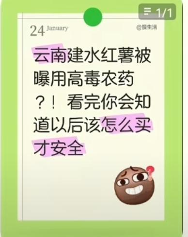 红薯好吃口难开 剧毒红薯被曝光 1月18日央视财经调查曝光云南省建水县,一些种植户在红薯地里使用剧毒农药“甲拌磷〞作为除草剂。 “甲拌磷”早在两年前已经被国家明令禁止生产和销售这款剧毒农药只要0.08克就可以导致人中毒身亡。 记者在卧底调查时与农户的对话令人气愤。那位受访的农户大言不惭的说 : “我们可以不吃,我们都卖给你们的”。 目前建水县相关部门已经介入该事件的调查,但一批一批夹杂着剧毒的红薯已经有流入市场。 如何鉴别、如何收回并销毁这些带毒的红薯,才是我们关心的。