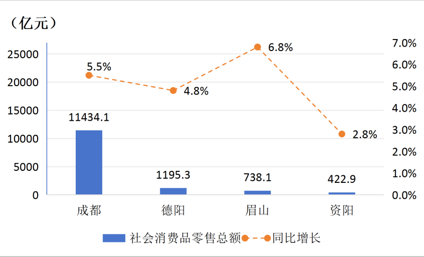 2025年成都都市圈四市社会消费品零售总额增速情况。