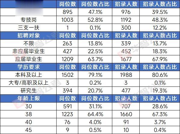 在今年招录的1899个岗位中,以工程师、财务会计和卫生保健员等为代表的专技岗居多,招录人数为1192人,占总人数约52.8%,同比减少13%。党务、人事、行政等管理岗共招976人(不含“三支一扶”岗位),约占总人数的39.2%,相较去年的1200人,缩减幅度近20%。此外,“三支一扶”岗位共计招录300人,相较去年小幅缩招。