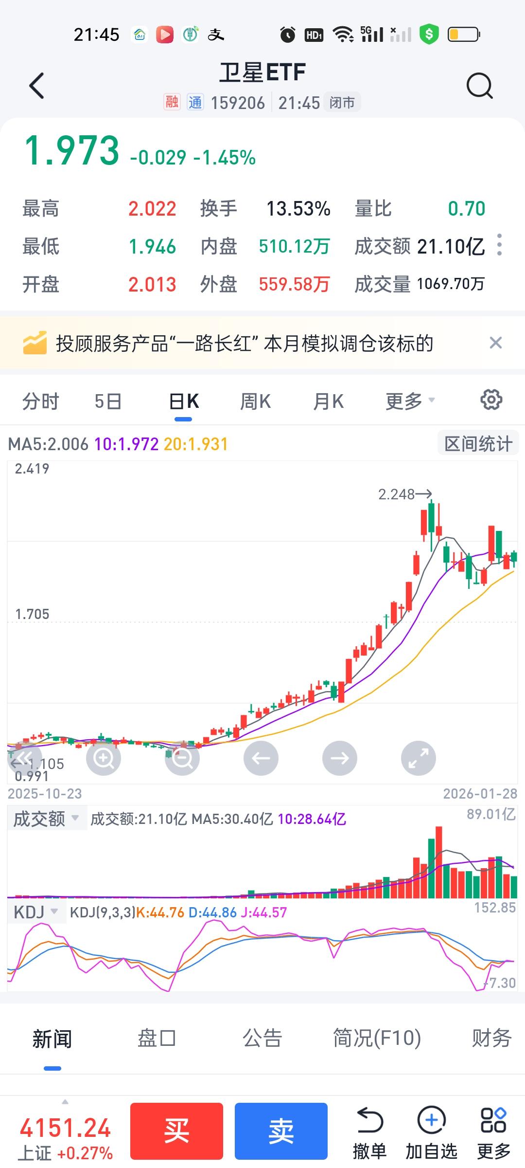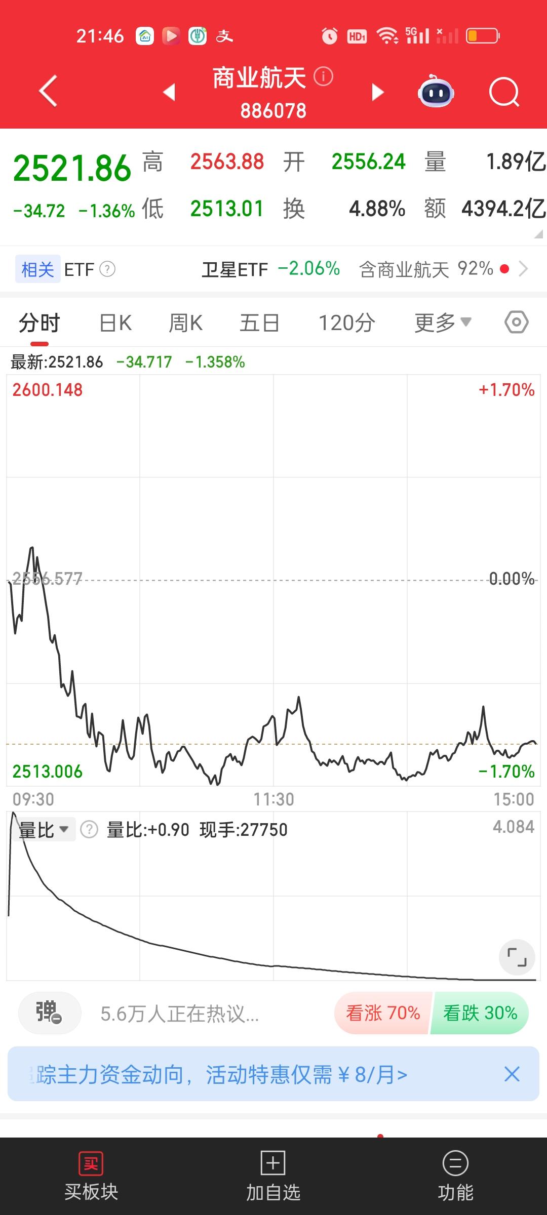 卫星ETF操作策略还是要提前想好,我认为很大概率还会考验一下20日线,20日线是1.931,收盘价1.973,这里有42个基点的空间,1.931/1.973=0.9787,有2.13%的下跌空间,明天可以直接在这个点位提前埋伏,如果直接在这个地方低开,可以自动买进。平开需要观察后面走势,高开很多需要先减一部分。 商业航天板块,20日线是2485.34,今天收盘价是2521.86,2485.34/2521.86=0.9855,也有只有1.45%的下跌空间。只要收盘不破20日线,依旧可以先拿着。不用慌!