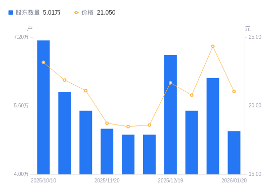 日期A股户数(户)流通A股户均持股数(股)户均持股市值(万元)2026-01-20500975556.0111.702026-01-09625134452.5010.842025-12-31548435075.2010.552025-12-19678854100.168.892025-12-10492715649.1510.512025-11-28492755648.6910.442025-11-20506595494.3710.292025-11-10548515074.4610.712025-10-31592604696.9210.282025-10-10712703905.429.05