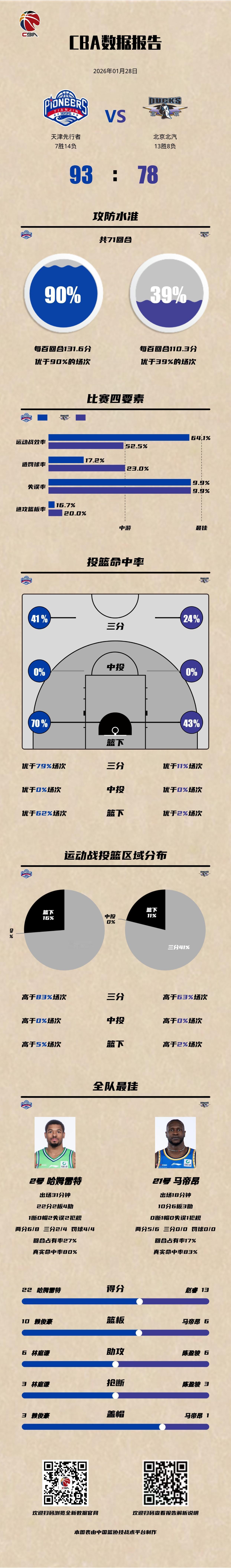 天津先行者 93-78 北京北汽天津男篮vs北京男篮 天津先行者:哈姆雷特22分4助攻,郑昊燃20分4篮板,赖俊豪14分10篮板3盖帽; 北京北汽:赵睿13分3篮板5助攻,贝利12分3篮板3助攻,斯佩尔曼12分3篮板。CBA数据库