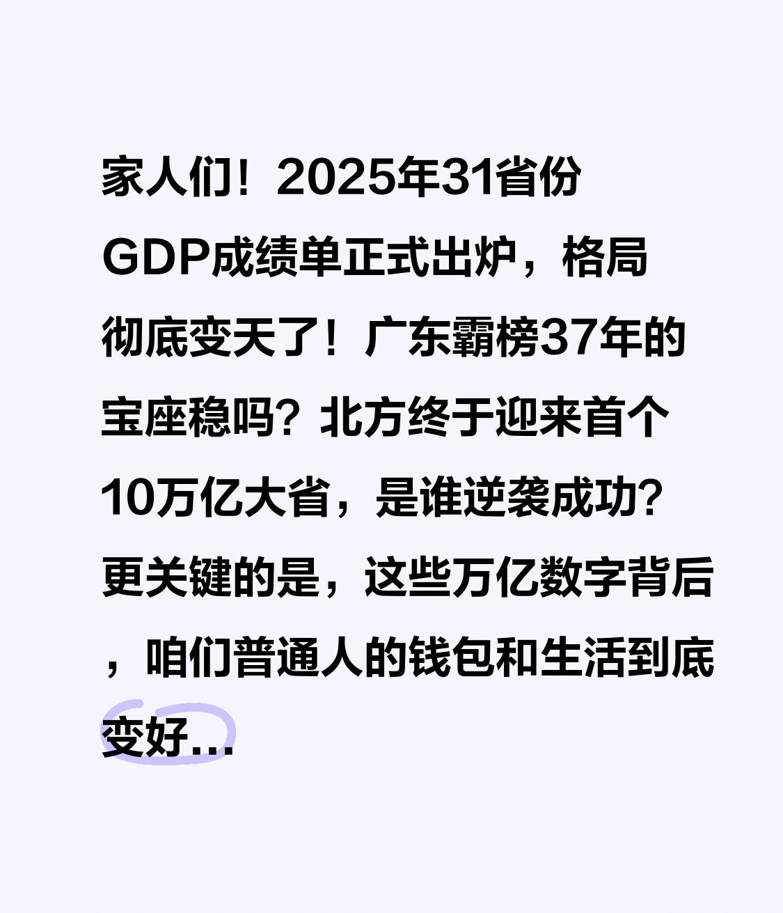 家人们!2025年31省份GDP成绩单正式出炉,格局彻底变天了!广东霸榜37年的宝座稳吗?北方终于迎来首个10万亿大省,是谁逆袭成功?更关键的是,这些万亿数字背后,咱们普通人的钱包和生活到底变好了多少? 先看最震撼的突破:山东以10.3万亿元GDP强势跻身“10万亿俱乐部”,成为北方第一个、全国第三个万亿大省,增速5.5%跑赢全国!要知道以前这个俱乐部可是南方省份的天下,现在山东带着绿色低碳转型和工业技改的硬实力,让北方经济终于回暖。而广东依旧以14.58万亿元领跑,但3.9%的增速略低于全国平均,和江苏14.23万亿元的差距缩小到3500亿,第一宝座岌岌可危! 但这里藏着关键转折:不是所有GDP高增长都能直接转化为民生获得感。比如西藏以7%增速全国第一,甘肃连续16个季度跑赢全国,靠的是新能源和工业投资发力;而经济大省山东,把75%的财政支出投向民生,2025年民生支出首破万亿,教育投入超1.3万亿,城镇新增就业124.5万人,这才是真正的“藏富于民”! 再看各省亮点:河南增速5.6%领跑十强,新能源汽车产量增长12.4%,“新三样”出口暴涨1.8倍,打工族的就业机会越来越多;浙江逼近10万亿,消费和出口双双高增,老百姓的购物车越来越满;江苏更狠,社会消费品零售总额突破4.6万亿全国第一,以旧换新政策惠及1810万人次,换家电、换汽车都能享补贴! 但也有冷思考:广东GDP总量第一,可增速没跑赢全国,而北京、上海人均可支配收入突破8万、9万,农村收入增速反超城镇。这说明GDP数字只是参考,真正的幸福是孩子教室里的空调、老人家门口的助餐点、年轻人稳定的工作机会——江苏给1.5万所学校装空调,温州社区食堂2.98元管饱,这些才是万亿GDP该有的温度! 你的省份今年表现如何?是跻身万亿俱乐部,还是增速逆袭?其实不管排名高低,咱们最关心的不过是“钱袋子鼓不鼓、日子顺不顺”。2025年的GDP成绩单,既是各省的比拼,更是普通人生活的底气。评论区留下你的省份,一起为家乡打call,也聊聊你感受到的生活变化!