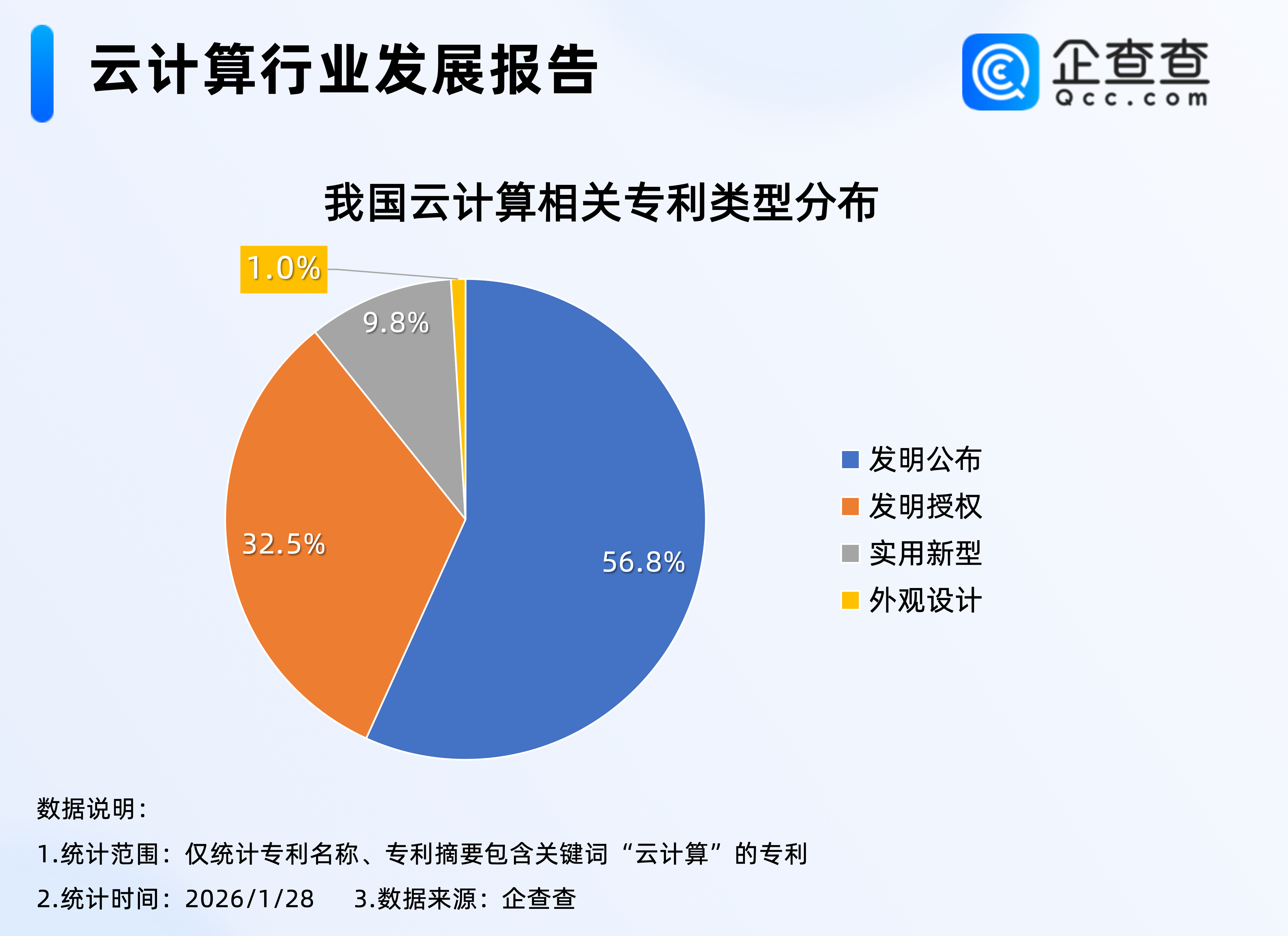 企查查数据显示,2025年全年,我国云计算相关企业注册量同比增加19.8%至17.04万家;截至1月28日,2026年我国已注册1.1万家云计算相关企业;区域分布上,2025年新注册的17万余家云计算相关企业中,超三成位于华东地区,其次是华南,占比18.0%。专利方面,截至1月28日,我国现有2.9万项云计算相关专利,其中发明公布占比56.8%。