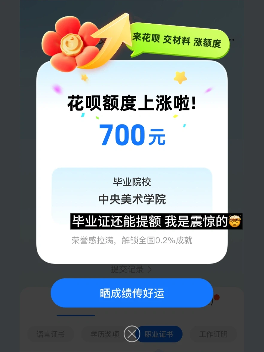 👉 打开支付宝搜「花呗提额」,上传自己的证书就可以了