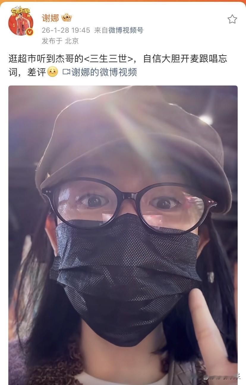 谢娜高调发文:我在超市也爱杰哥。 1月28日,谢娜在社交平台发布了一条动态,短短十几个字,让许多网友直呼:我又吃上了狗粮。 她发文说: “逛超市听到杰哥的《三生三世》,自信大胆开麦跟唱忘词,差评。” 她还配了一条视频,视频中的谢娜,带着帽子和口罩,还带了黑框眼镜,在超市听见了张杰的歌,于是她跟着唱,前几句她只动嘴没有发出声音, 到最后两句,她唱出了声音,结果没想到忘词了。 视频的最后她还俏皮的说了一句:超市遇到你了喽。 网友们看了她的视频,都开始逗她: 1、没事娜姐,你俩唱的词,凑在一起这首歌就全了。 2、不是一家人不进一家门,张杰也一直忘歌词,你也忘词,不愧是夫妻。 网友字里行间都是对谢娜和张杰这对夫妻的另一种秀恩爱。 谢娜的社交平台,有多一半的动态都和老公张杰有关。 这对夫妻,从开始的不看好,到如今有了三个女儿,张杰开演唱会,谢娜只要没有工作都会到现场支持老公,在外面只要一听到张杰的歌,就很激动。 娱乐圈还是真夫妻好嗑。