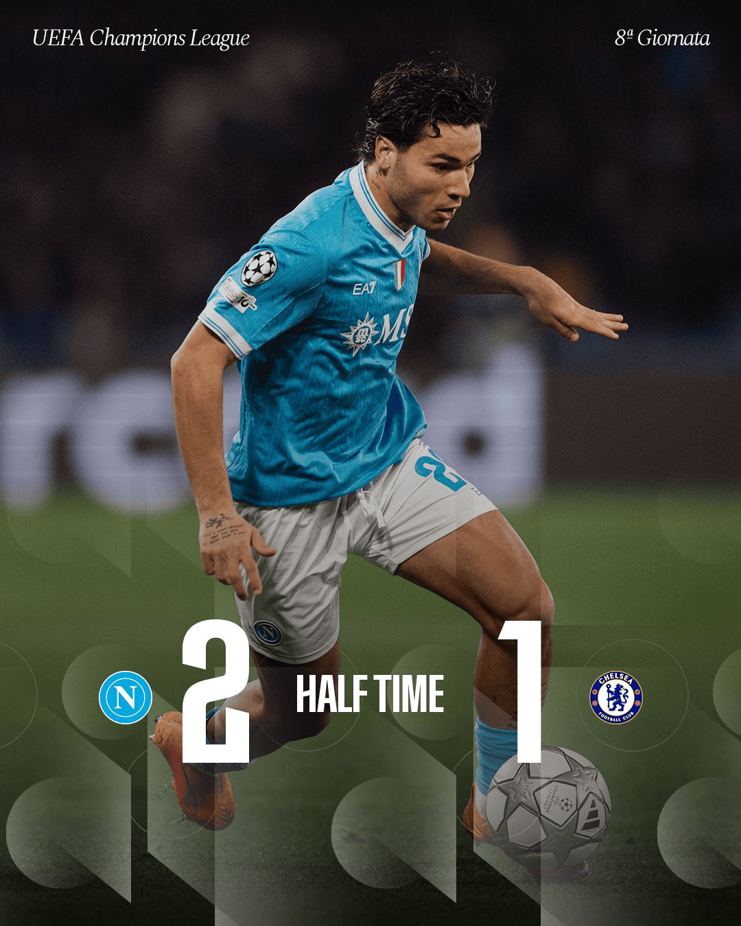 虎扑01月29日讯欧冠联赛阶段,那不勒斯主场迎战切尔西。上半场比赛结束,那不勒斯2-1领先。