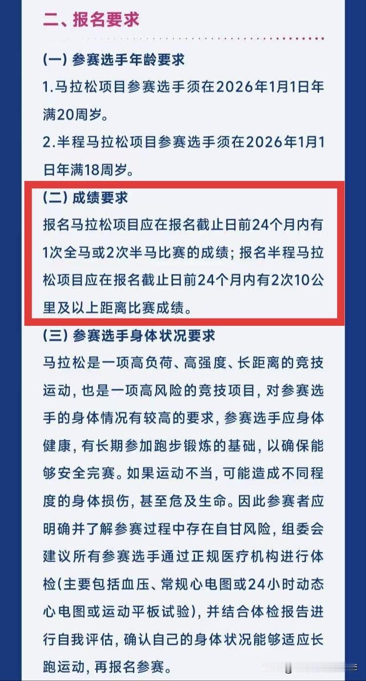 2026大连马拉松将于4月26日7:30开跑,报名于2月3日启动,抽签结果将于2月28日上午10点公布! 不少人对今年大马设的报名成绩要求(图2)有疑义,这个要求很正常。 因为每年都要很多跑不下来也报名的人,最后不能完赛浪费了名额,不如把机会给总跑马的人。 如果说谁都有第一次的话,可以先报没有条件的比赛,比如省内的盘锦马拉松,还不抽签,今年跑次盘锦,明年就可以报大连马拉松了。