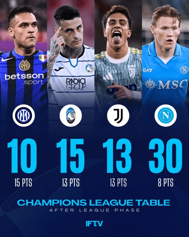 欧冠联赛阶段意甲球队排名: