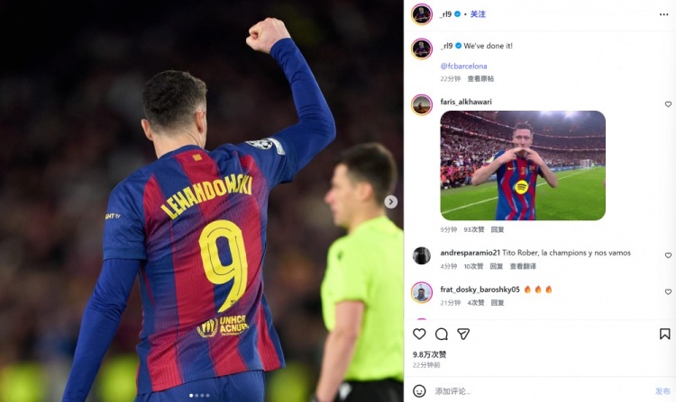 巴萨也成功直通16强。莱万也在赛后通过社媒晒出自己的振臂庆祝照,并配文:“我们做到了!”