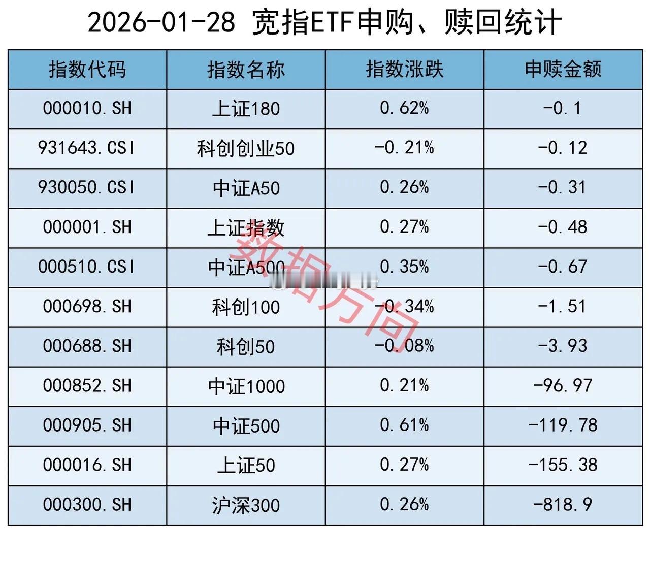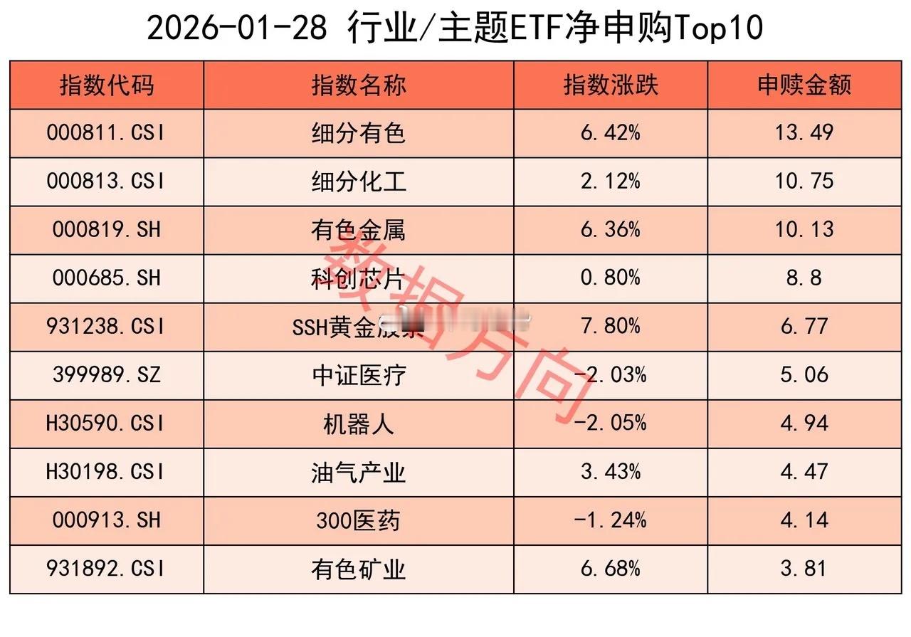 狂卖1100亿!事出反常必有妖1月28日星期三,大盘全天震荡整理,有色金属、油气、煤炭、钢铁等涨幅居前。上证指数涨幅0.27%,上交所ETF合计净赎回1113.61亿元。这不仅是连续第11天净赎回,而且1113.61亿的金额,再次创出单日净赎回的最高纪录。昨天收盘以后,净空单创出了16万手的历史最高纪录。很难在这两项数据同时创新高的时候,还当作什么事情都没有发生。数据方向希望老铁们都能把自己照顾好,不要太激进了。隔夜外盘,国际金价狂涨超过6%,今年一个月时间不到,其累计涨幅已高达25%。事出反常必有妖!有没有一种风雨欲来的感觉?宽指所有宽指全部净赎回。沪深300指数(-818.9亿),仅此一家净赎回已经超过800亿。上证50指数(-155.38亿)、中证500指数(-119.78亿)、中证1000指数(-96.97亿),净赎回都在100亿附近及以上。科创50指数(-3.93亿)、科创100指数(-1.51亿)、中证A500指数(-0.67亿)、上证指数(-0.48亿)、中证A50指数(-0.31亿)、科创创业50指数(-0.12亿)、上证180指数(-0.1亿),分别被小幅净赎回。行业和主题 细分有色指数(13.49亿)、细分化工指数(10.75亿)、有色金属指数(10.13亿)、SSH黄金股票指数(6.77亿)、油气产业指数(4.47亿)、有色矿业指数(3.81亿),一起进入申购榜。中证医疗指数(5.06亿)、300医药指数(4.14亿),一起进入申购榜。其他进入申购榜的还有:科创芯片指数(8.8亿)、机器人指数(4.94亿)。红利指数(-4.51亿)、上国红利指数(-2.53亿)、中证红利指数(-0.95亿)、港股通高股息港元指数(-0.88亿)、标普中国A股大盘红利低波50指数(-0.66亿),一起进入赎回榜。香港证券港元指数(-3.1亿)、证券公司指数(-0.69亿),一起进入赎回榜。其他进入赎回榜的还有:港股通科技指数(-2.39亿)、中证钢铁指数(-2.24亿)、半导体材料设备指数(-0.82亿)。ETF黄金白银基金暂停申购
