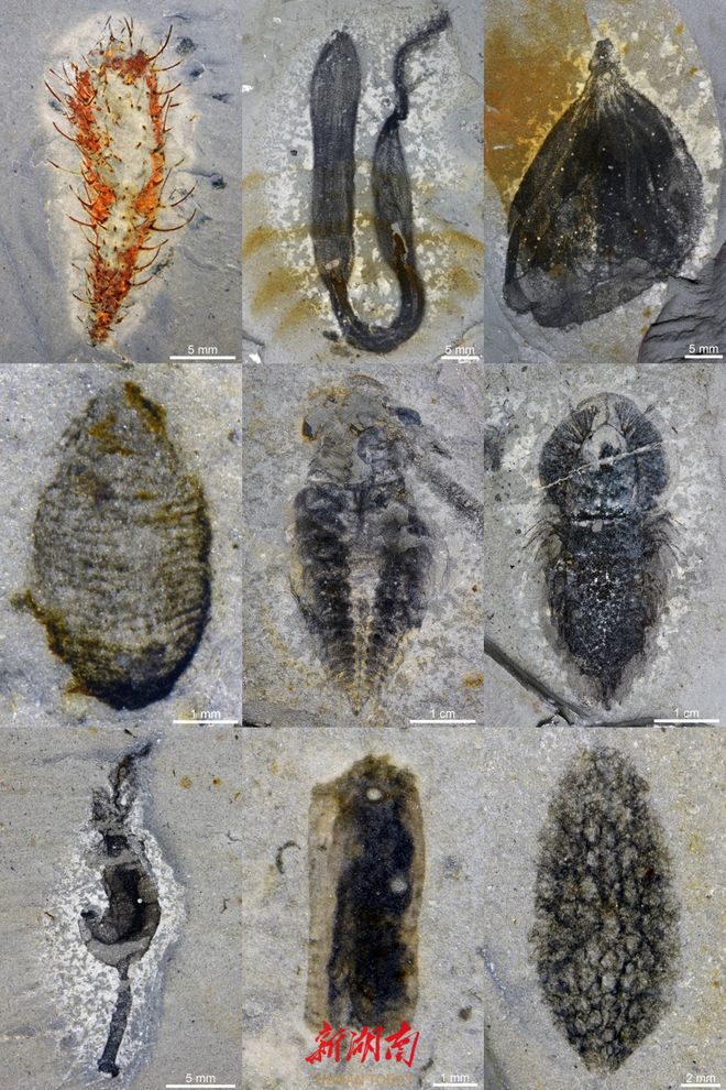 花垣生物群代表性软躯体动物化石:从左至右、从上至下依次为开腔骨、海绵、栉水母、蠕虫、奇虾类、娜罗虫、爬胃虫、被囊动物、分类不明囊状动物