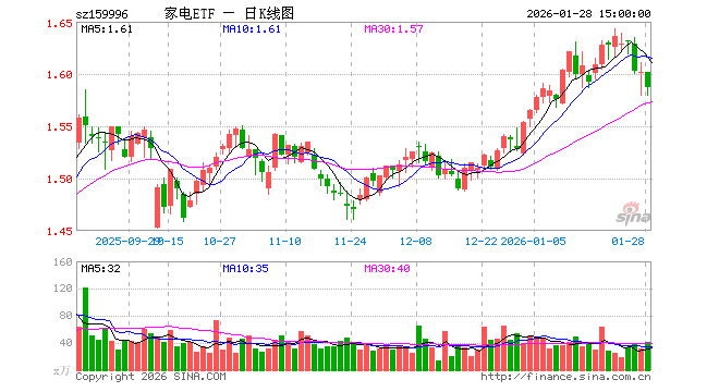 1月28日,家电ETF(159996)跌0.94%,成交额6532.19万元。当日份额减少2200.00万份,最新份额为8.91亿份,近20个交易日份额减少3600.00万份。最新资产净值计算值为14.11亿元。