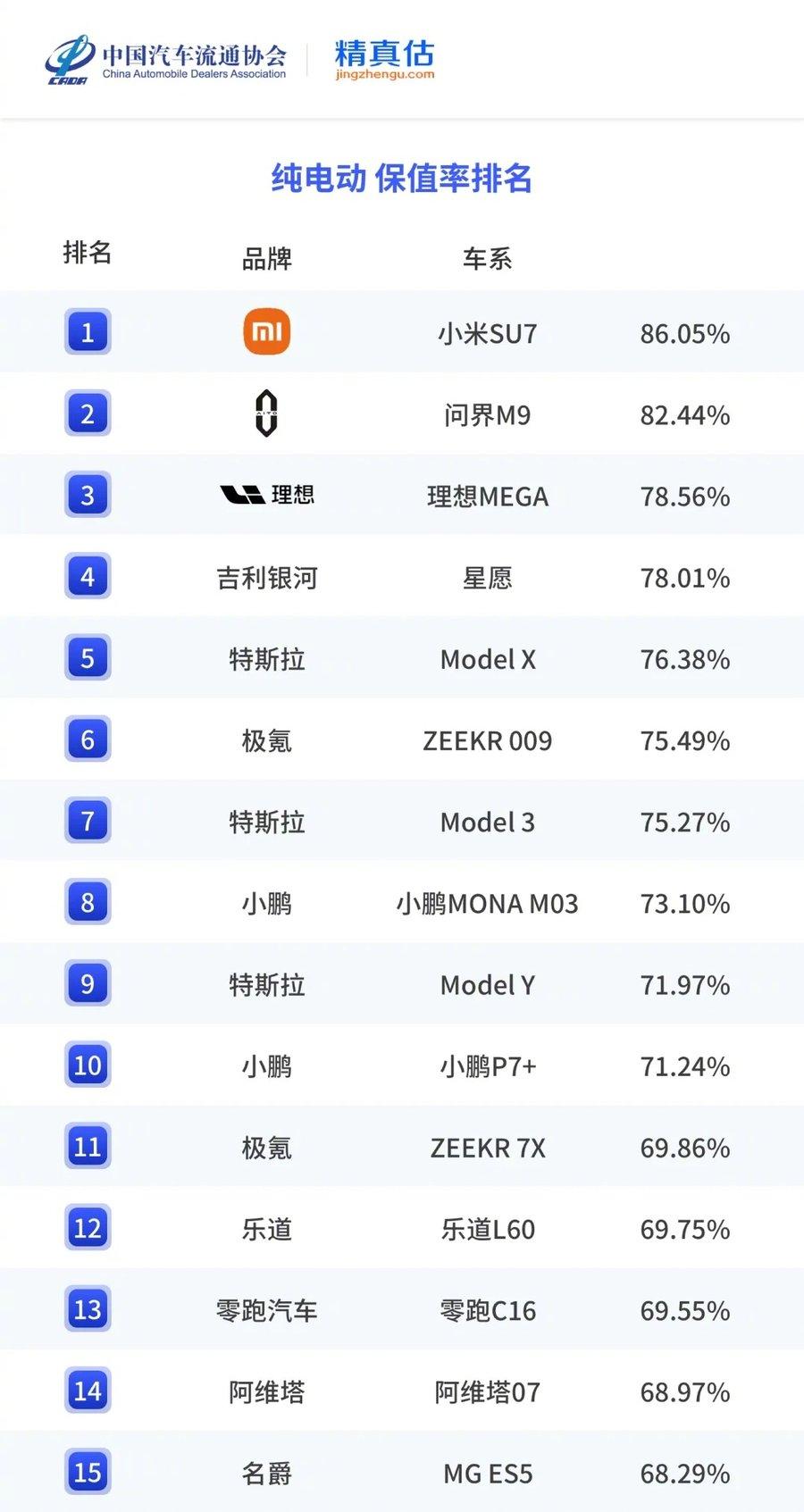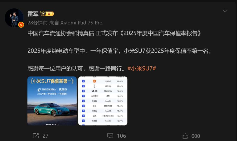 小米汽车又拿下了一个含金量十足的第 一!近日中国汽车流通协会和精真估发布的《2025年度中国汽车保值率报告》显示,小米SU7以86.05%的一年保值率登顶纯电车型榜单,直接力压问界M9 EV的82.44%,成为2025年纯电市场最保值的车型,雷军也一时间发文致谢用户,这份成绩在纯电车普遍开一年打7折的行业现状里,显得格外亮眼。