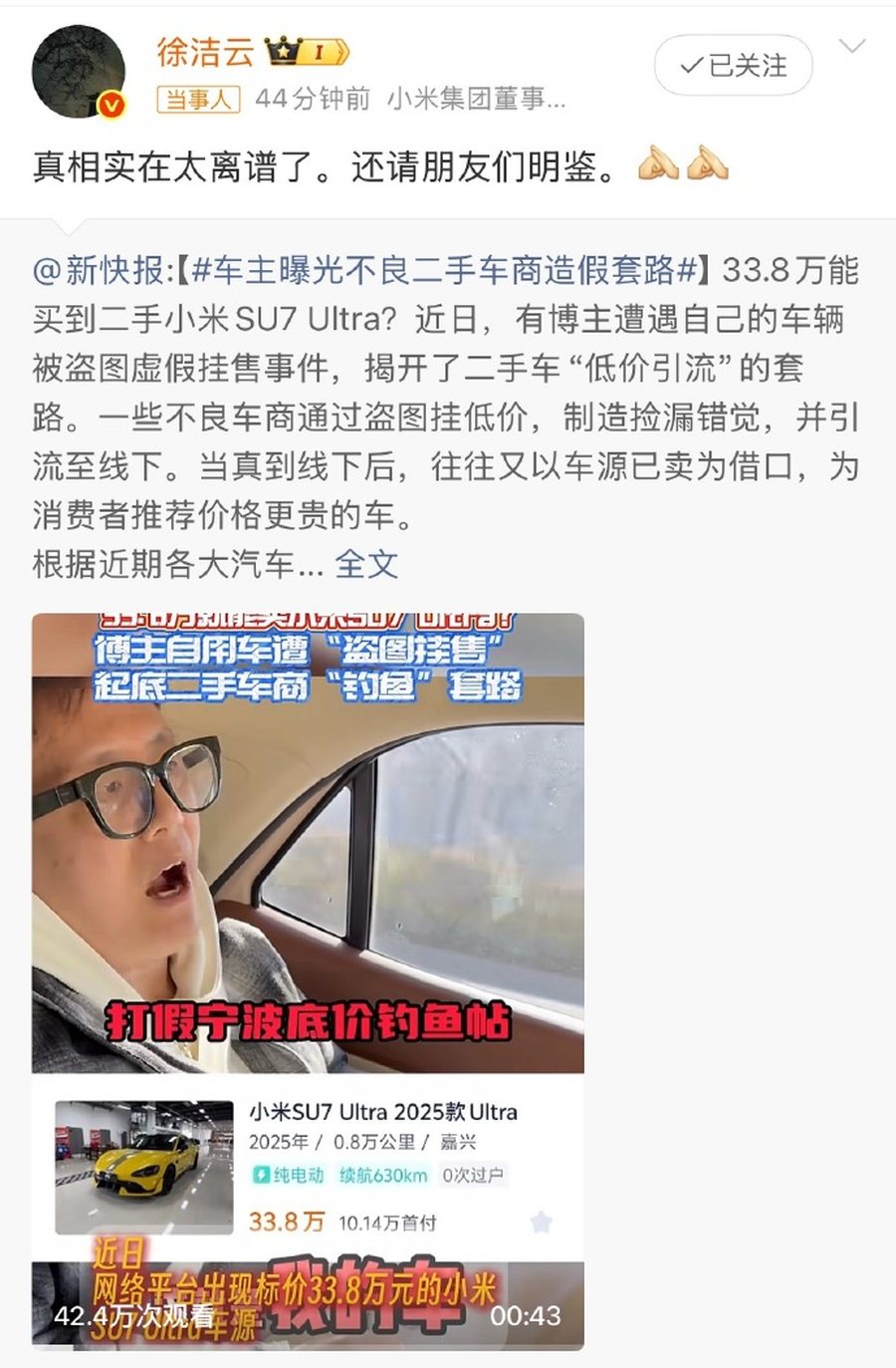 但这份亮眼的保值率数据,却始终伴随着不小的争议。一边是官方86.05%的权威数据,另一边却是二手车市场的价格分化:部分高里程小米SU7贬值幅度超8万元,旗舰版SU7 Ultra更是出现半年贬值15万的情况,不少车商直言收车即亏损,对小米车型持谨慎态度。当然,不排除一些二手车商故意制造小米汽车二手车价格崩盘的舆论,小米徐洁云此前也以及辟谣表示,网上“15万捡漏SU7、30万出头拿下 SU7 Ultra”全是车商套路。