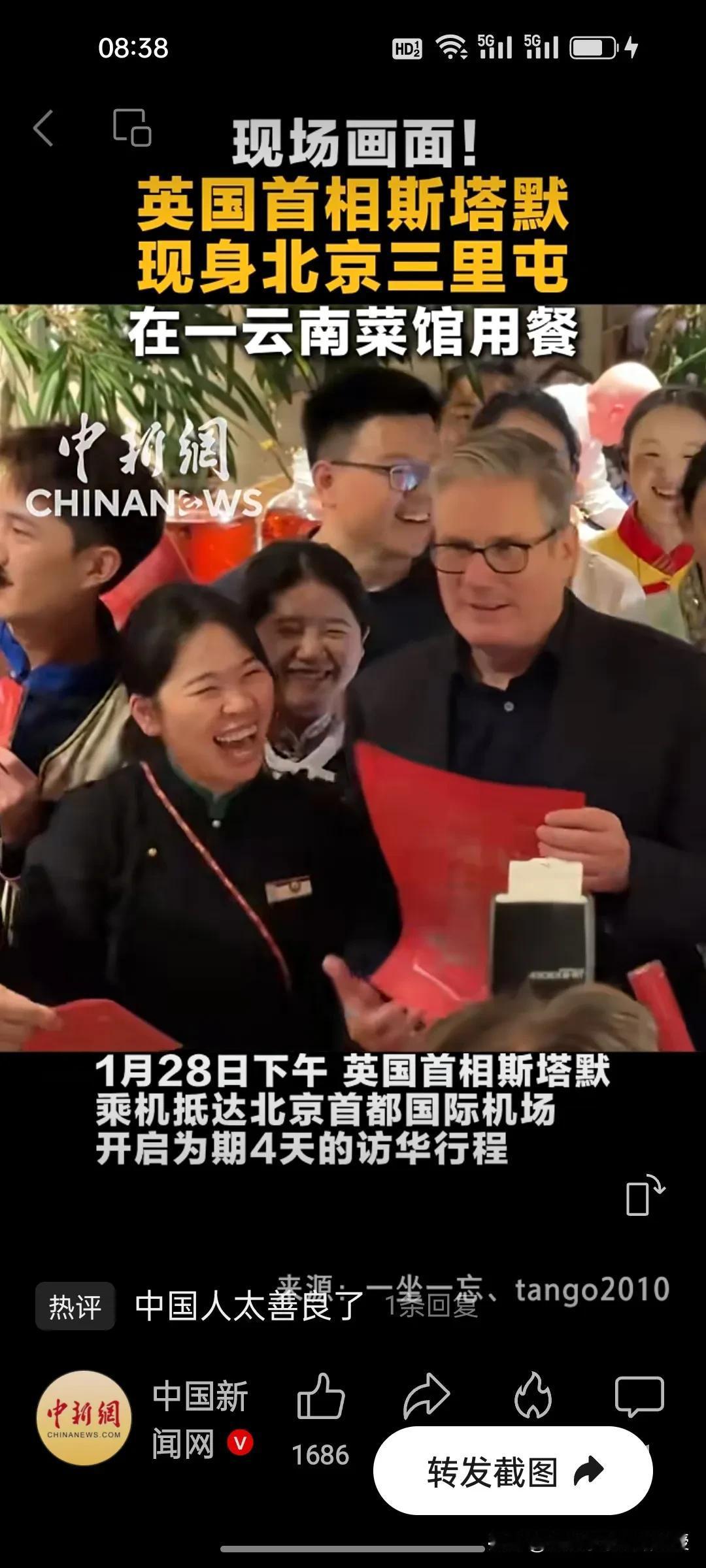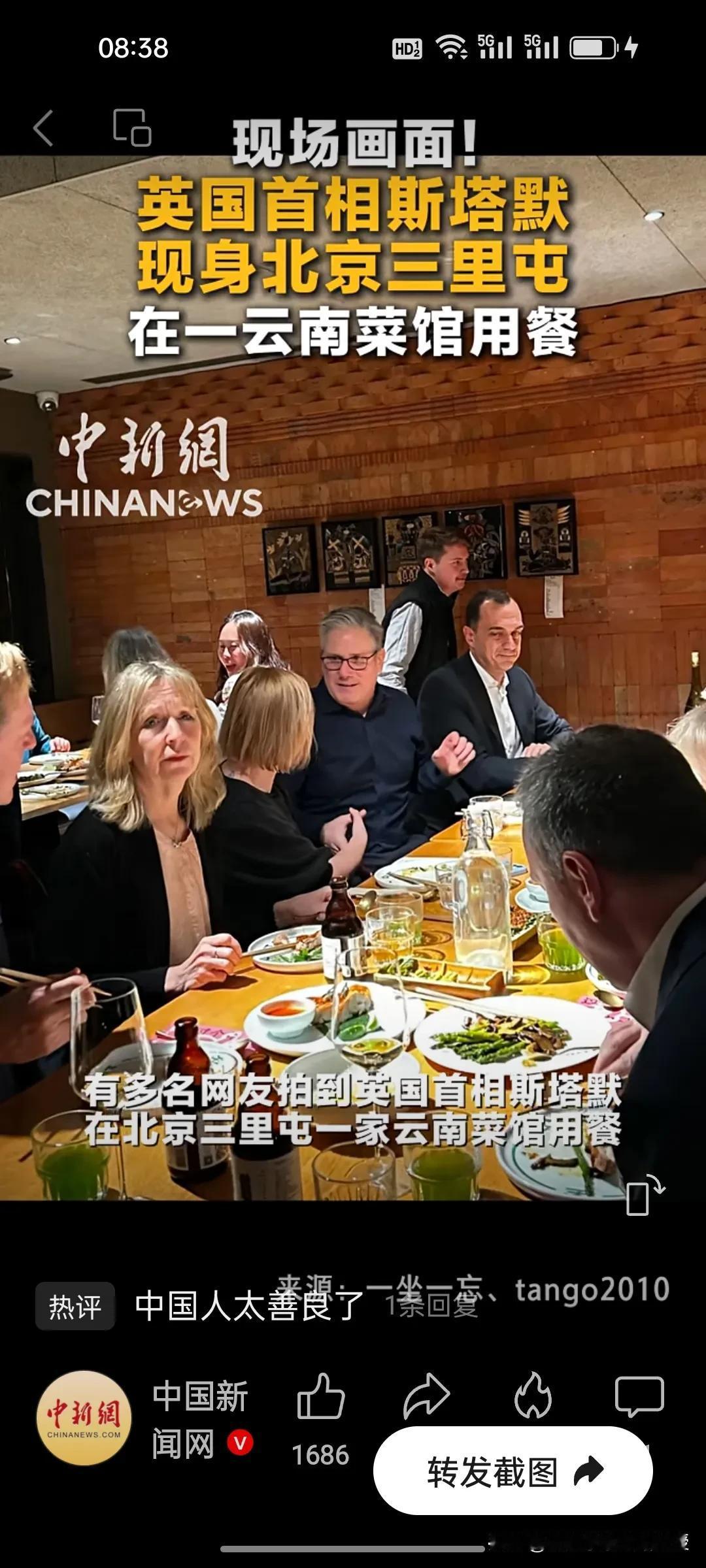 英国首相斯塔默访华首日,就走进三里屯的“一坐一忘”云南菜馆,在大堂和普通食客拼桌吃饭,没有包间、没有特殊待遇,还笑着和店内服务员以及中国游客合影。这一幕,体现出他无比亲民,这比任何外交辞令都更有说服力。 这是英国首相8年来首次访华,而一顿接地气的云南菜,正是中英关系升温的体现。从前两天英伟达创始人黄仁勋打卡同一家店,到英国首相坐大堂吃饭,北京的烟火气里,藏着大国交往的新姿态。 国与国的亲近,从来都在人与人的相处里。这样的“双向奔赴”,才是中英关系回稳向好最扎实的底气!