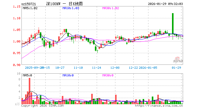1月29日,深证100ETF永赢(159721)开盘跌0.69%,报1.013元。深证100ETF永赢(159721)重仓股方面,宁德时代开盘涨0.15%,中际旭创涨1.43%,新易盛涨1.77%,美的集团涨0.48%,东方财富跌0.53%,立讯精密跌0.53%,阳光电源涨0.07%,比亚迪跌0.73%,五粮液涨0.00%,胜宏科技涨0.23%。