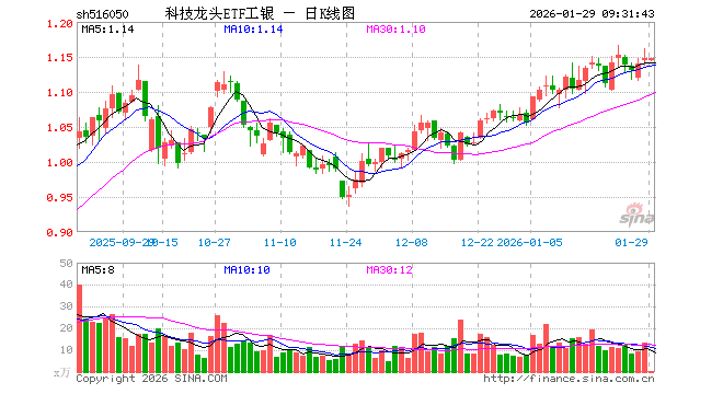 1月29日,科技龙头ETF工银(516050)开盘跌0.26%,报1.144元。科技龙头ETF工银(516050)重仓股方面,中际旭创开盘涨1.43%,新易盛涨1.77%,恒瑞医药跌0.35%,中芯国际跌0.74%,药明康德跌0.08%,海光信息涨0.03%,北方华创跌1.00%,胜宏科技涨0.23%,京东方A跌0.22%,兆易创新涨1.92%。
