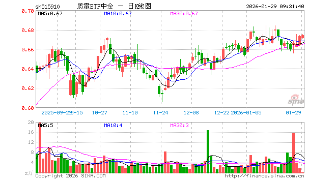 1月29日,质量ETF中金(515910)开盘跌0.30%,报0.671元。质量ETF中金(515910)重仓股方面,中际旭创开盘涨1.43%,紫金矿业涨3.52%,新易盛涨1.77%,贵州茅台涨0.85%,工业富联跌0.02%,五粮液涨0.00%,洛阳钼业涨2.57%,阳光电源涨0.07%,北方华创跌1.00%,美的集团涨0.48%。