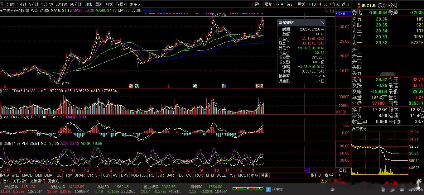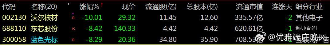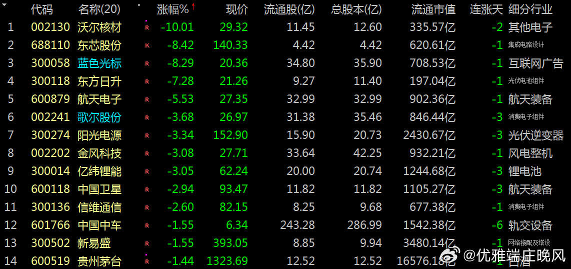 【财富晚茶】蛟龙携款逃逸:01.28收盘主力:资金净流出前20股票导语:作者系《头条号》新锐创作者。曾经网易原创作者和知名网易号旅游领域创作者。大跨度行业等的写作,颇受网友喜爱。作品发表于2026.01.28.23:58 优雅端庄晚风。【内容概述】今日股市收评:主题是:【财富晚茶】蛟龙携款逃逸:01.28收盘主力:资金净流出前20股票。主旋律:今日主力资金:净流出前20股。蛟龙见顶劫款兑现:且战且退落袋为安。一、视野最新:资金涌出谁在杀跌002130 沃尔核材688110 东芯股份300058 蓝色光标1、风险公司:高位杀跌第一、002130 沃尔核材 靓丽底牌:热缩材料及通信电缆产品领域的全球龙头制造商。全球热缩材料行业中排名第一。全球电信电缆制造商(涵盖高速铜缆)中排名第三。中国最大的高速铜缆制造商。中国电缆附件行业电缆附件制造商中排名第一。电子材料、新能源汽车、电力传输等多个领域具有领先地位。 第二、688110 东芯股份 靓丽底牌:存储芯片领域龙头中国。国内SLC NAND Flash领域的龙头企业。中国利基型存储芯片设计领域处于领先地位。国产存储芯片替代引领者。第三、300058 蓝色光标靓丽底牌:营销传播行业全球龙头。中国企业出海营销领域的绝对领导者。中国AI营销技术应用龙头。二、主力资金:谁在携筹兑现出逃1、300058 蓝色光标收盘价: 20.36元。涨跌幅:-8.29%。净流入: -24.66亿2、300274 阳光电源收盘价: 152.90元。涨跌幅: -3.34%。净流入: -17.67亿3、600519 贵州茅台收盘价:1323.69元。涨跌幅:-1.44%。净流入: -13.33亿4、300750 宁德时代 收盘价:339.99元。涨跌幅: 0.17%。净流入: -12.59亿5、600879 航天电子收盘价: 27.35元。涨跌幅: -5.53%。净流入: -12.57亿6、002241 歌尔股份收盘价:26.97 元。涨跌幅:-3.68%。净流入: -11.21亿7、002130 沃尔核材收盘价:29.32元。涨跌幅:-10.01%。净流入: -10.85亿8、002475 立讯精密 收盘价:53.28元。涨跌幅:-0.82%。净流入: -9.80亿9、600118 中国卫星收盘价: 93.47元。涨跌幅:-2.94%。净流入: -9.17亿10、688110 东芯股份收盘价:140.33元。涨跌幅:-8.42% 。净流入: -8.95亿11、601766 中国中车收盘价: 6.34元。涨跌幅: -1.55%。净流入: -8.32亿12、002185 华天科技 收盘价:15.20 元。涨跌幅:3.68%。净流入: -8.28亿13、601318 中国平安收盘价: 64.75元。涨跌幅:-0.86%。净流入: -8.12亿14、002202 金风科技收盘价: 27.71 元。涨跌幅-:3.08%。净流入: -7.08亿15、300136 信维通信 收盘价:82.15元。涨跌幅: -2.60%。净流入: -6.86亿16、300118 东方日升收盘价:21.26元。涨跌幅: -7.28%。净流入: -6.69亿17、300502 新易盛 收盘价:393.05 元。涨跌幅:-1.55%。净流入: -6.13亿18、600549 厦门钨业收盘价:64.94元。涨跌幅: 1.15%。净流入: -6.03亿19、300014 亿纬锂能收盘价: 62.24元。涨跌幅: -3.05%。净流入: -6.01亿20、600089 特变电工 收盘价:28.06元。涨跌幅:-0.85%。净流入: -5.94亿三、视野背景:短中长期调仓换股追击杀跌:原形毕露:2026年1月28日收盘时:电子、集成电路、光伏、航天装备板块集体大跌,主要受以下四项政策性利空因素叠加冲击:1、光伏退税:提前发酵第一、光伏出口退税全面取消 系统重估:财政部、税务总局于2026年1月公告,自2026年4月1日起全面取消光伏产品增值税出口退税,该政策虽未立即生效,但市场提前定价引发对出口企业利润结构的系统性重估。第二、退税新政损失百亿损失百亿:按原9%退税率测算,新政将使单块210R组件出口利润减少46–51元,行业年均退税损失约153亿元;第三、行业亏损期前发酵2025年全行业亏损超310亿元,30%低效产能面临出清,叠加海外价格战加剧,企业盈利预期被大幅下修。此前2024年退税率已从13%下调至9%,此次取消为政策优化的延续,但市场情绪因“预期兑现”而剧烈反应。2、证监融券:停限售股第一、原本利好解读利空证监会融券:制优化被误读为流动性收紧信号。2026年1月28日,证监会宣布:全面暂停限售股出借(自1月29日起实施)第二、实时可用次日可用利好政策:误解利空:转融券市场化申报由“实时可用”调整为“次日可用”(3月18日起实施)。该项政策:本意为抑制机构套利、保护中小投资者。但是机构:市场误读:为“流动性收紧”与“做空工具受限后反向压制多头”,尤其冲击高估值科技板块。第三、融券新低转融券降融券余额创四年新低,ETF转融券出借规模下降92%,市场情绪由“博弈”转向“避险”。3、美国对华:管制升级第一、长期豁免调整年审2026年1月,美国政府将对三星、SK海力士等韩企在华工厂的半导体设备出口许可证,由“长期豁免”调整为“年度审查”。许可证审查常态化,导致设备交付周期延长、维护成本上升,直接冲击中国先进制程芯片产能爬坡节奏;第二、三星西安依赖美国三星西安、SK海力士无锡/大连工厂依赖美国应用材料、Lam Research等企业的关键蚀刻与光刻设备。第三、市场担忧国产替代市场担忧:“国产替代”进程受阻,叠加英伟达等海外芯片巨头股价波动传导,科技成长板块估值承压。4、 商航政策:不及预期第一、北京遥感兑现落差尽管北京市于2026年1月发布《促进商业卫星遥感数据资源开发利用的若干措施》,鼓励并购重组与数据资产化,但市场对“政策利好兑现”产生落差。第二、朱雀三号火箭推迟原预期2026年将密集首飞的“朱雀三号”“智神星一号”等新型火箭推迟;第三、航天机电商航预亏多家商业航天概念股发布业绩预告,如航天机电预亏3.9