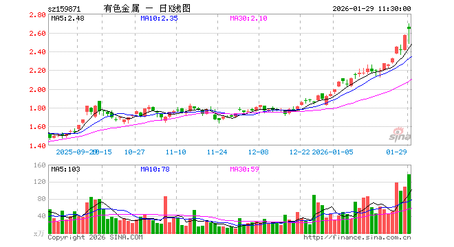 1月29日,截止午间收盘,有色金属ETF(159871)涨2.37%,报2.634元,成交额3.61亿元。有色金属ETF(159871)重仓股方面,紫金矿业截止午盘涨3.00%,洛阳钼业涨2.98%,北方稀土涨8.34%,华友钴业跌2.24%,中国铝业涨5.14%,赣锋锂业涨0.48%,山东黄金涨3.89%,云铝股份涨1.98%,中金黄金涨6.39%,中矿资源涨0.77%。