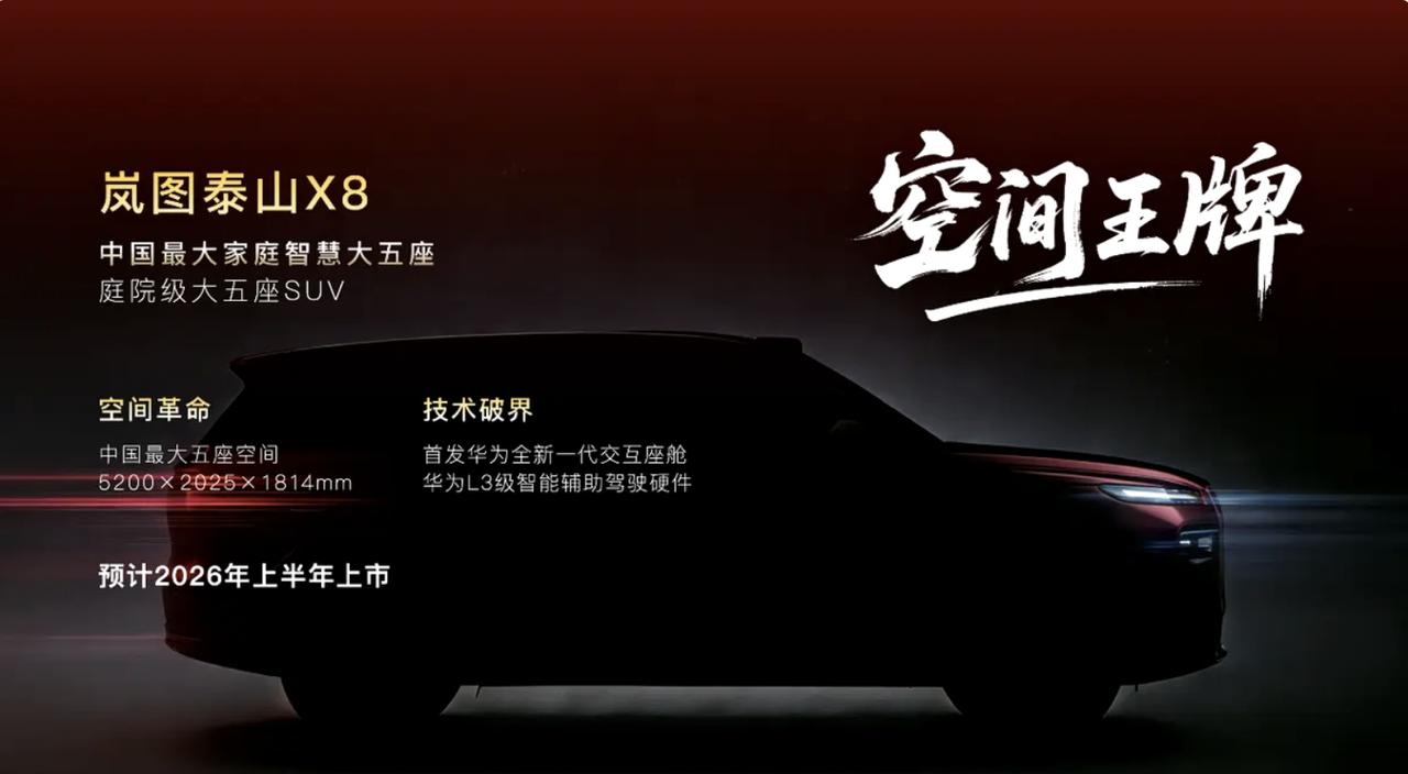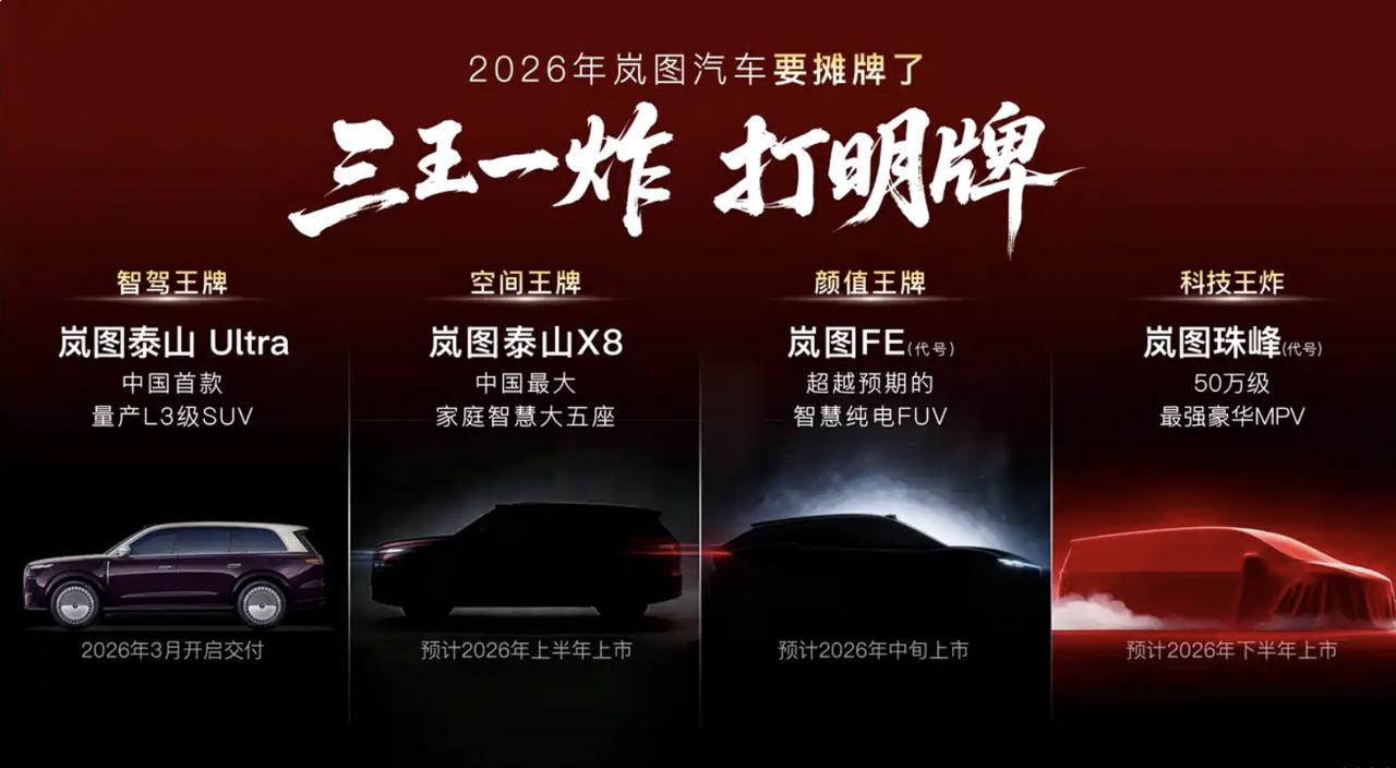 四款重磅车型!岚图2026年产品规划曝光! 【泰山Ultra】作为首款量产L3级SUV,搭载华为乾崑智驾四激光方案,配备6个智驾小蓝灯,将于3月开启交付,并近期OTA升级至ADS 4.1。 【泰山X8】定位大五座大型SUV,搭载问界M9同款四激光雷达,首发华为新一代交互座舱,车身尺寸5200/2025/1814mm,将于2026年上半年上市。 【FE新车型】定位全新FUV(跨界多功能车),预计主打年轻化与个性化市场,将于2026年中旬推出。 【“珠峰”MPV】全球首发12项黑科技,将成为全球首款搭载L3自动驾驶的MPV及首款配备超级魔毯的MPV,与梦想家形成产品组合,计划于2026年下半年上市。【来自懂车帝车友圈】