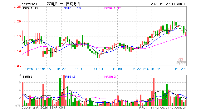 1月29日,截止午间收盘,家电ETF易方达(159328)跌0.43%,报1.156元,成交额174.62万元。家电ETF易方达(159328)重仓股方面,三花智控截止午盘跌1.79%,格力电器跌0.81%,美的集团涨1.65%,海尔智家跌0.96%,麦格米特跌3.72%,四川长虹涨0.00%,石头科技涨0.13%,海信视像涨1.15%,科沃斯涨0.55%,兆驰股份涨1.52%。