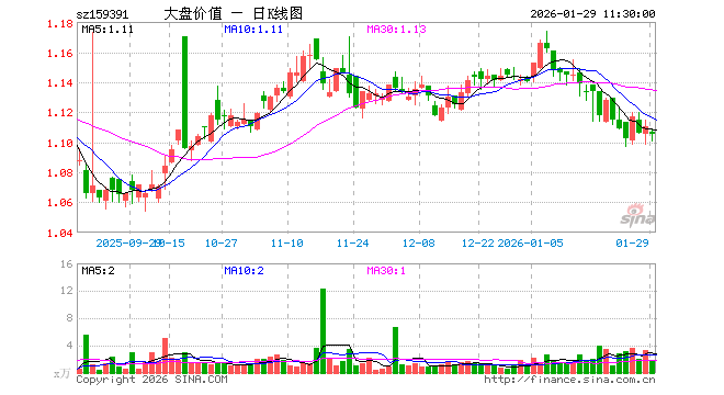 1月29日,截止午间收盘,大盘价值ETF博时(159391)跌0.45%,报1.105元,成交额181.79万元。大盘价值ETF博时(159391)重仓股方面,中国平安截止午盘涨0.71%,招商银行涨0.16%,美的集团涨1.65%,兴业银行跌0.70%,工商银行涨0.14%,农业银行跌1.47%,伊利股份跌0.99%,交通银行跌0.76%,格力电器跌0.81%,中国神华跌1.00%。