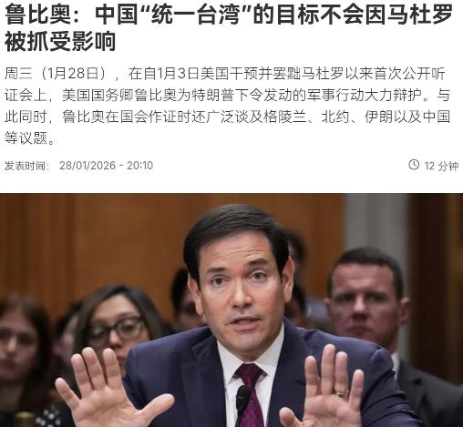 罕见!美国在台湾问题上重大转向,鲁比奥暗示台湾问题就是中国的内政问题!1月29日,根据法新社报道,美国国务卿鲁比奥表示,中国提出的“统一台湾”目标不会受到其他国际事件的影响,包括此次针对马杜罗的行动。台湾问题是一个历史遗留项目,中国已经非常明确地表明了他的意图,而这与世界上发生的其他事情无关。 鲁比奥这话乍一听,像突然转了性子。但放眼下棋的棋盘,美国这步棋早有伏笔。去年五角大楼的国防战略报告,34页里一个“台”字都没提——要知道四年前的版本,可是明晃晃写了四次。这种文字消失不是笔误,是美国在台海牌桌上,终于摸到了烫手的筹码。 过去二十年,美国把台湾当遏制中国的“万能钥匙”,军售、窜访、舆论造势,样样不落。但这两年突然发现,钥匙插进锁孔转不动了。 解放军的“区域拒止”能力,让美军兵棋推演算出个残酷结论:航母进台海1600公里圈,存活率不到30%。这种赔本买卖,商人出身的美国政客算得比谁都清楚——真打起来,台湾保不住,西太霸权还得崩,何苦呢? 更要命的是美国自己的后院起火了。国内通胀、党争、产业链空心化,哪样不需要花钱?拉美国家左转,墨西哥毒品暴力蔓延,巴拿马运河的控制权都开始晃荡。与其在台海耗着,不如把航母调回加勒比海,先守住自家门口。这不是仁慈,是霸权收缩的保命逻辑——就像赌徒输光筹码,总得先保住裤衩。 鲁比奥的“内政说”,本质是给民进党当局断奶。过去二十年,美国嘴上喊着“战略模糊”,实际让台当局误以为“美国会出兵”。现在突然改口,等于拆穿了皇帝的新衣:台海真打起来,美军大概率只卖武器、不出人命。看看最近美军的动作:把“林肯”号航母调去中东,在台湾设的“弹药测试场”全是消耗品订单——摆明了要在撤离前,再薅最后一把羊毛。 但别误会美国在“弃台”。他们只是换了玩法。以前是明火执仗支持“台独”,现在改成“静默掏空”:台积电赴美建厂,2500亿投资要台当局担保;对台军售专挑贵的、短平快的武器,打完就得续单。这种操作,比直接介入更阴损——不是保护,是抽血,等台湾的芯片产能、外汇储备被掏空,连当棋子的价值都没了。 最有意思的是岛内反应。绿营政客还在喊“美台关系坚若磐石”,但基层民众早看透了。去年台湾商业总会调查,68%的中小企业主担心被美国当炮灰。连台媒都忍不住说:美国每次“挺台”,都是把台湾往火坑推。现在鲁比奥的话,对这些人来说,与其说是打击,不如说是早就该醒的凉水。 中国这边,其实早把主动权攥在手里。解放军的绕台演训常态化,台海中线早就不存在。去年“正义使命-2025”演习,直接把台湾岛围成铁桶——这不是秀肌肉,是告诉所有人:不管美国说什么,台海的事,中国人自己说了算。美国现在不提台湾,恰恰说明他们明白:再怎么蹦跶,也挡不住中国统一的大势。 说到底,鲁比奥的表态,是美国霸权衰退的缩影。以前能用航母吓唬人,现在只能靠嘴炮维持存在感。但中国不吃这一套——台湾问题是核心中的核心,谁也别想讨价还价。美国战略收缩也好,玩文字游戏也罢,都改变不了一个事实:解决台湾问题,中国人有决心、有能力,更有耐心。这盘棋,咱们早就算到了终局。