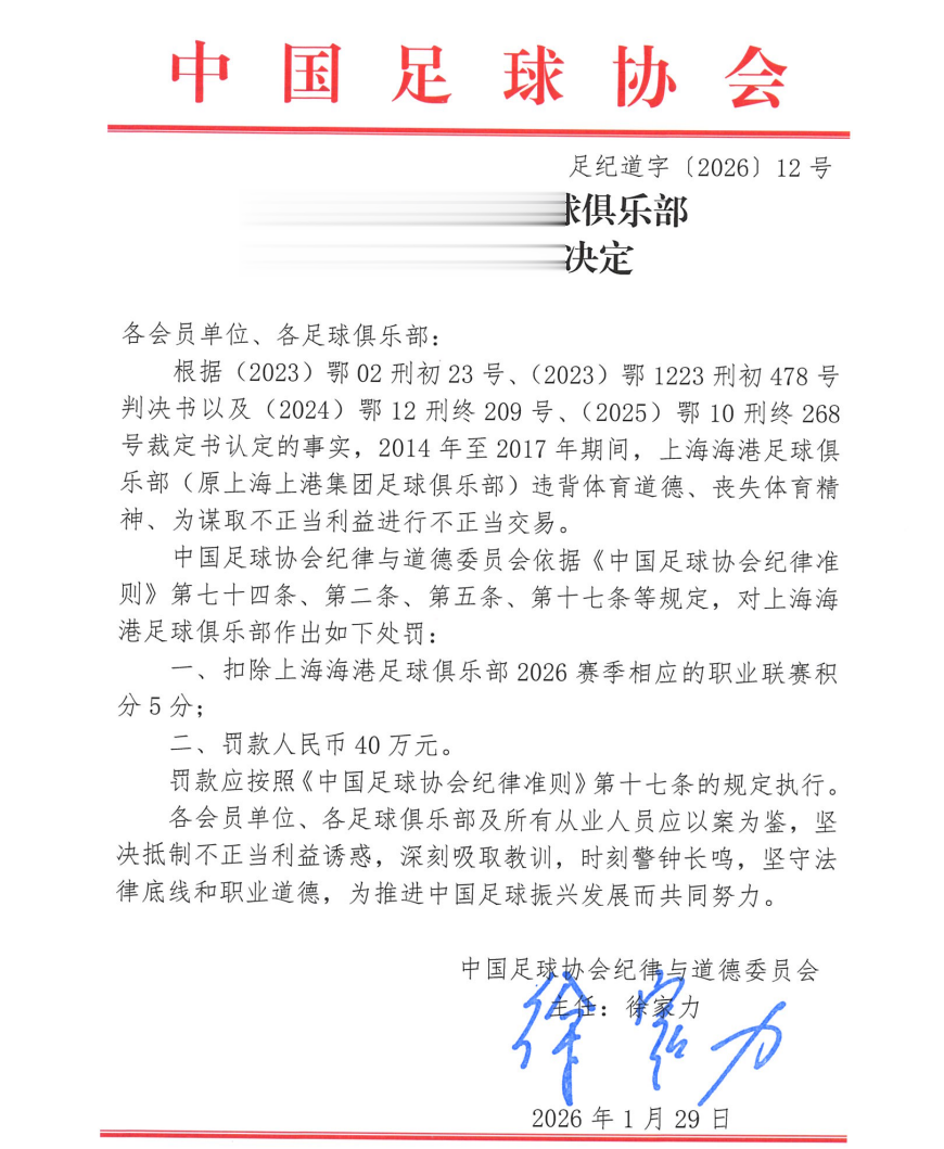 一、扣除上海海港足球俱乐部2026赛季相应的职业联赛积分5分;