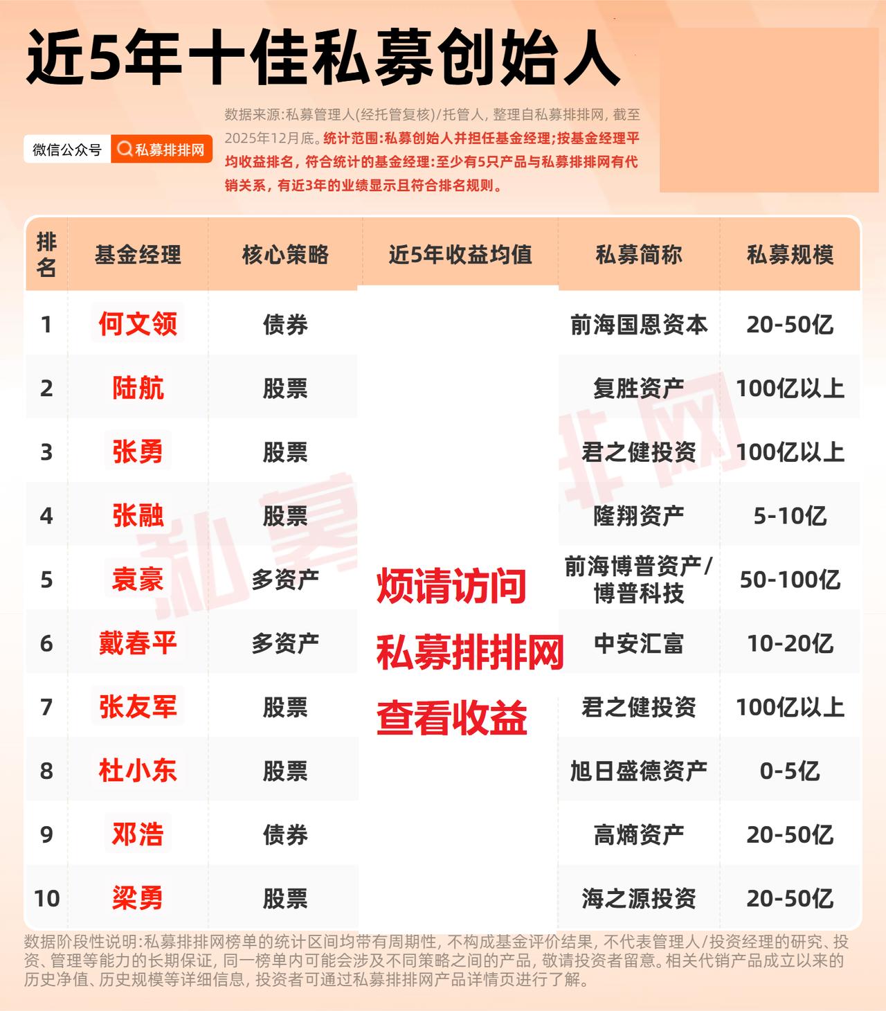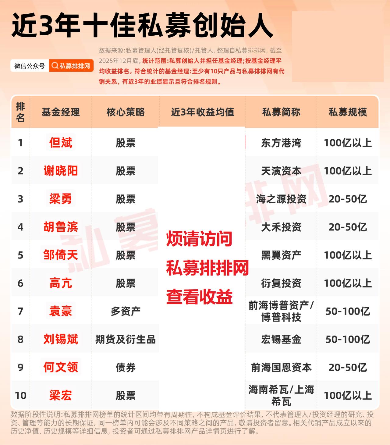 十佳私募创始人业绩排名(近三年、近五年) 点击查看最新业绩详情: 私募创始人作为公司的灵魂人物,一般拥有独特的投资理念和盈利模式,在私募行业乃至资本市场都具备一定知名度,因此他们的业绩备受投资者关注。 那么,在刚过去的2025年,十佳私募创始人都有谁?穿越近3年、近5年牛熊的私募创始人又有哪些? 一、私募基金公司创始人近3年业绩一览 截至2025年末,根据私募排排网统计,旗下满足排名要求并有业绩展示的产品达到10只及以上的私募创始人共有14位。从管理规模看,其中6位来自百亿级私募,另有5位所属机构为准百亿(管理规模50-100亿元)梯队。 近三年业绩排名中,位列前十的私募创始人依次为:东方港湾但斌、天演资本谢晓阳、海之源投资梁勇、大禾投资胡鲁滨、黑翼资产邹倚天、衍复投资高亢、前海博普资产袁豪、宏锡基金刘锡斌、前海国恩资本何文领以及海南希瓦梁宏。 二、私募基金公司创始人近5年业绩一览 截至2025年12月底,私募排排网数据显示,旗下具备业绩展示且符合排名条件的产品达5只及以上的私募创始人中,共计40位入围。 按照公司规模来看,来自百亿级私募的创始人有13位,来自管理规模在50亿至100亿元之间的“准百亿”私募的创始人有7位。 近5年十佳私募创始人的分别是:前海国恩资本何文领、复胜资产陆航、君之健投资张勇、隆翔资产张融、前海博普资产袁豪、中安汇富戴春平、君之健投资张友军、旭日盛德资产杜小东、高熵资产邓浩、海之源投资梁勇。