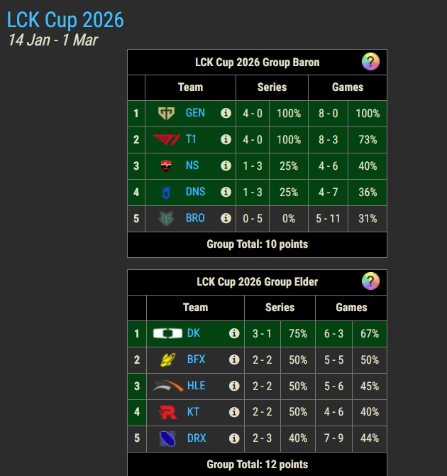 直播吧1月29日讯昨日LCK超级周,大龙组的BRO不敌DRX,0-5结束小组赛的赛程,导致大龙组目前10分,而远古龙组已经12分。