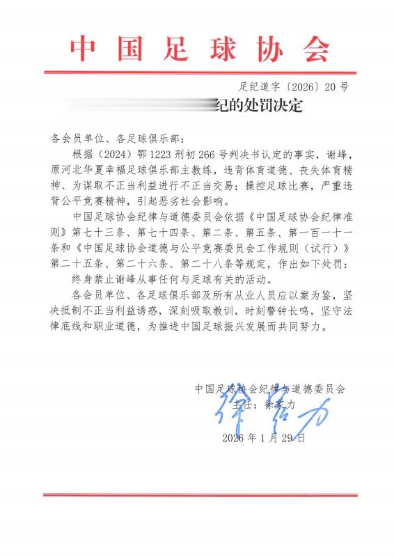 直播吧01月29日讯足协发布“假赌黑”处罚结果,原河北华夏幸福足球俱乐部主教练谢峰,违背体育道德、丧失体育精