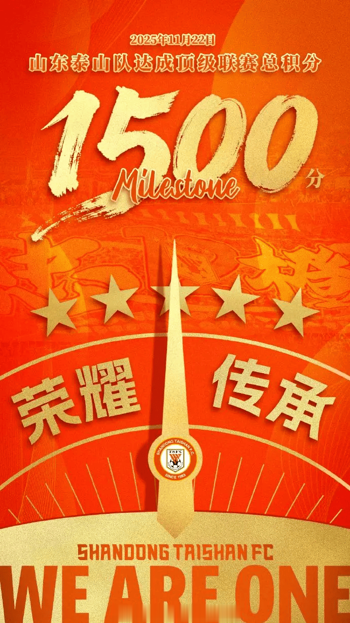 山东泰山足球俱乐部官方社媒介绍称:“2025中超联赛收官之战,山东泰山队客场5-1战胜武汉三镇队。山东泰山足球俱乐部在中国顶级联赛荣获积分1500分,成为中超球队首支达到这一里程碑的俱乐部。这份荣耀凝结着历任泰山队球员的精诚团结、顽强拼搏,汇集着社会各界对泰山队的关心关爱、鼎力支持。在此,更要衷心感谢广大球迷朋友的深情相伴和热忱追随。未来,山东泰山足球俱乐部将始终秉持“泰山队精神”,与所有支持者同心筑梦,传承山东足球荣光,续写时代绿茵传奇。”