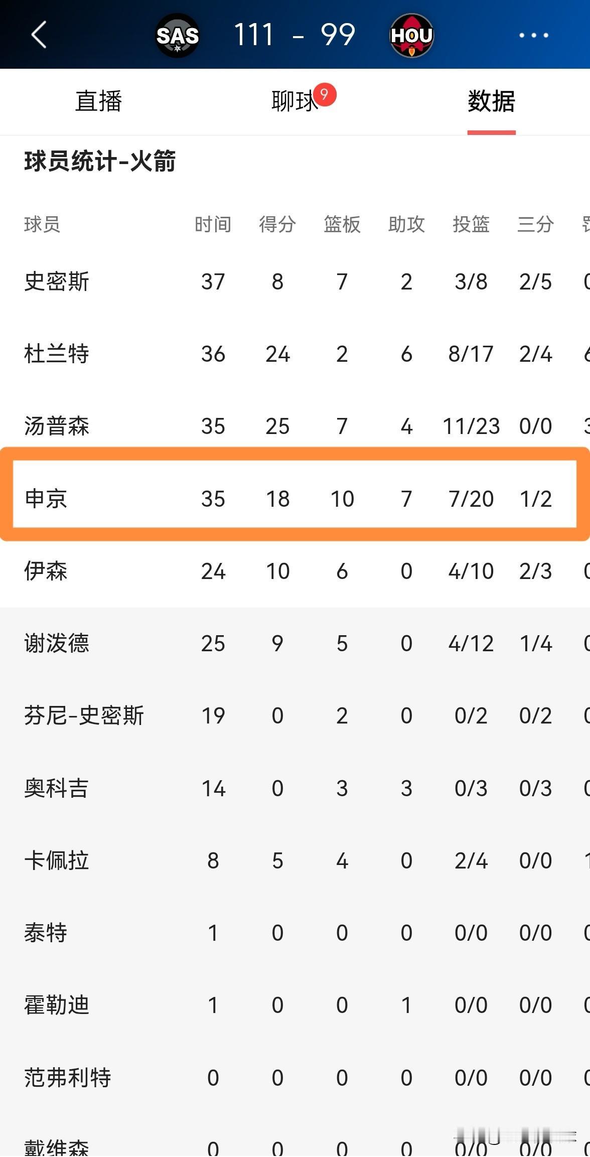 火箭当家中锋申京真是不会用脑子打球!在今天火箭主场以99:111输给马刺的比赛中,申京首发出战35分钟,投篮20中7,其中三分球2中1、罚球7中3非常低效的得到18分,还有5次犯规,他的场上正负值为-14。 本场比赛申京在场上再次出现了乱打的情况,当申京头脑发热的时候,他的眼里只有篮筐而没有队友,他的很多投篮选择都是不合理的。