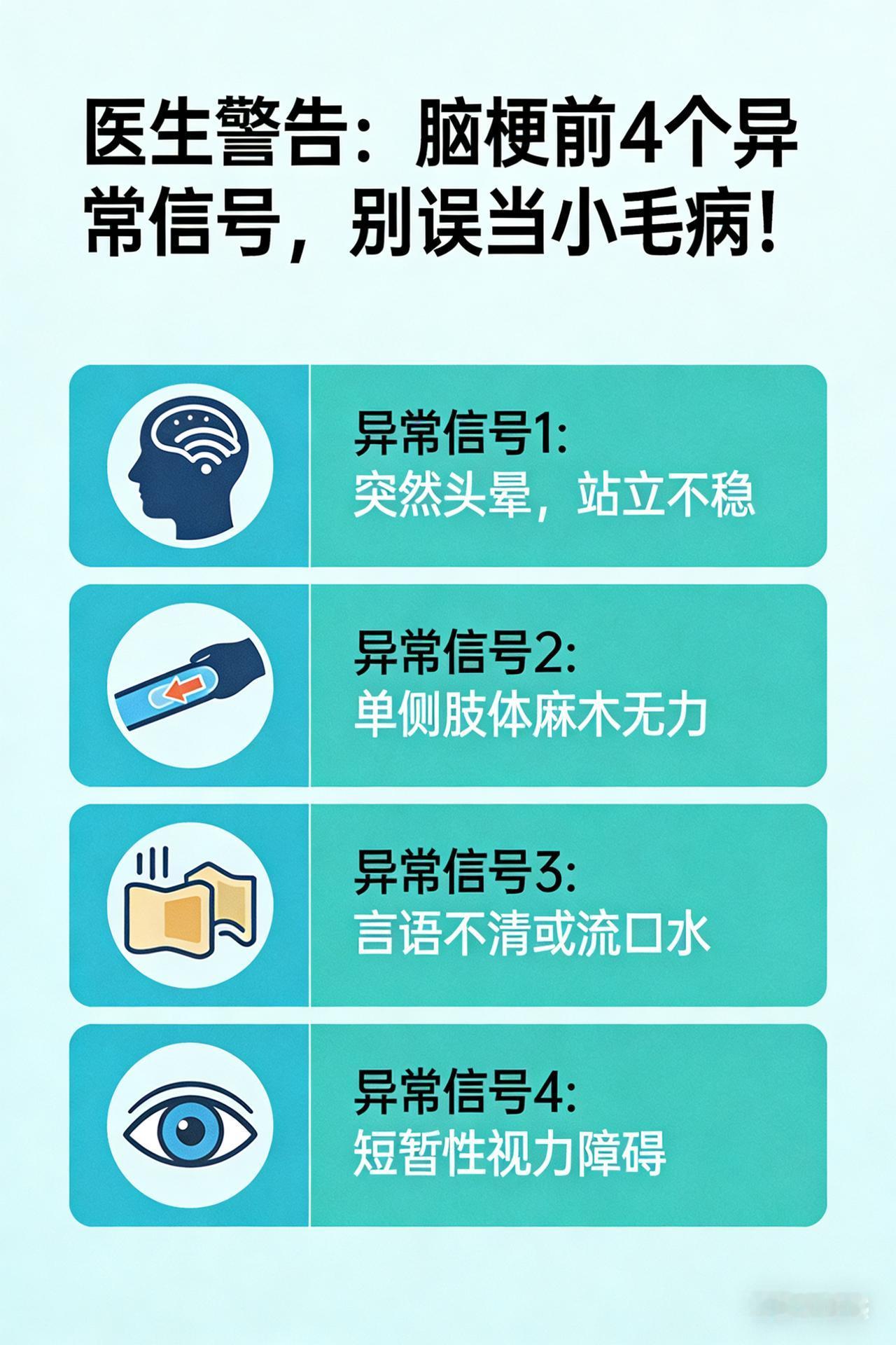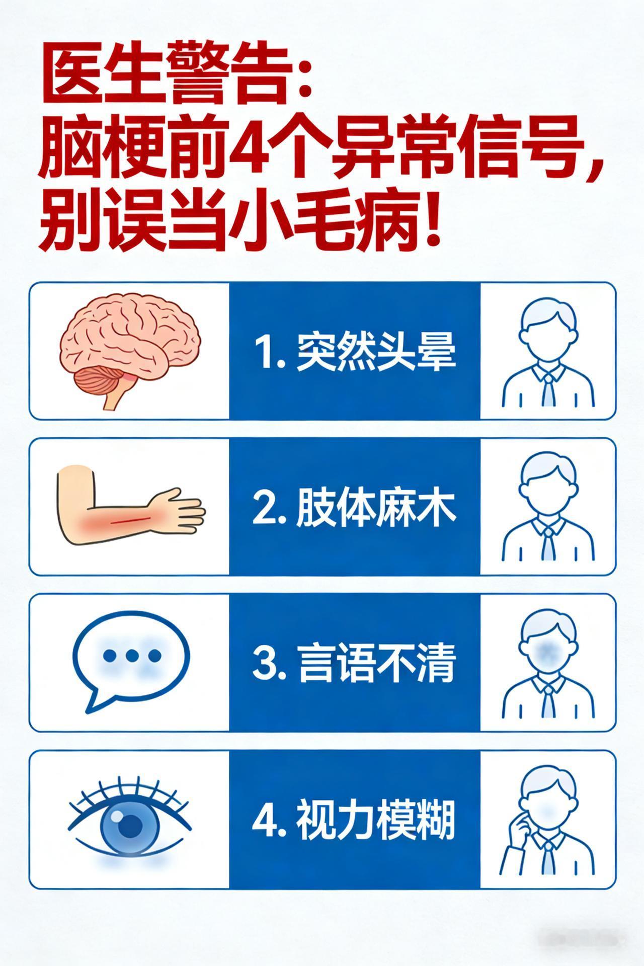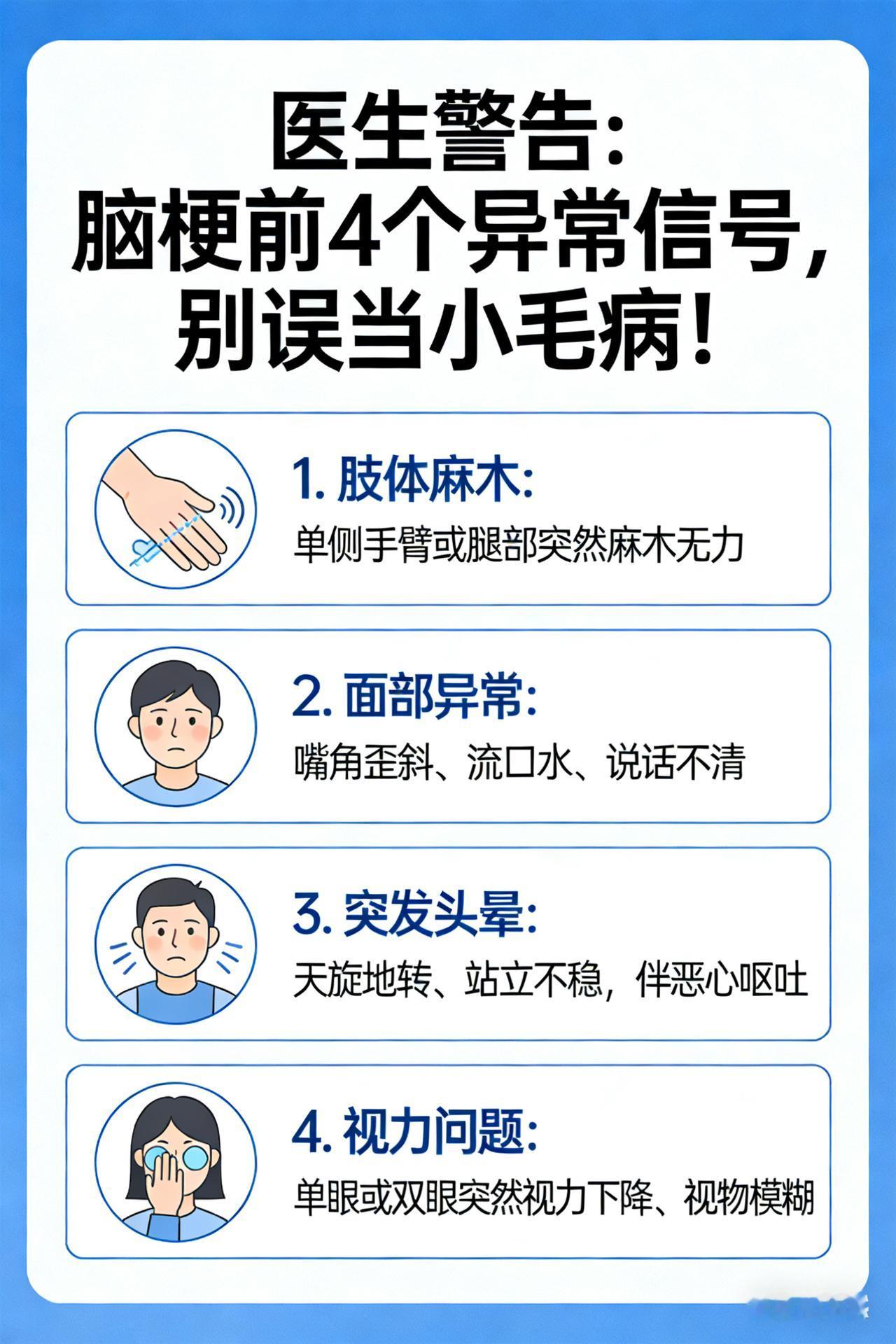 医生警告:脑梗前 4 个异常信号,别误当小毛病! 医生提醒:早期脑梗并非以头晕为主症,这4个异常信号需高度警惕 在神经内科的临床实践中,脑梗塞作为一种高致残率、高致死率的脑血管疾病,犹如一颗隐藏在人体内的“定时炸弹”,严重威胁着人类的健康与生命安全。早期精准识别脑梗塞的蛛丝马迹,并及时采取有效的干预措施,对于改善患者预后、降低疾病负担具有至关重要的意义。然而,公众普遍存在一个认知误区,即认为头晕是脑梗塞的首发症状。实际上,临床数据显示,近八成脑梗塞患者在疾病早期并无明显头晕表现,反而是以下4个异常信号,更应引起我们的高度警惕。 单侧肢体感觉与运动障碍:大脑缺血的“局部警报” 大脑的运动皮层与感觉皮层犹如精密的“指挥中心”,分别负责调控对侧肢体的运动与感觉功能。当供应这些区域的脑动脉发生微小栓塞,或者因血管痉挛、血液黏稠度增高等因素导致血流动力学改变时,局部脑组织会出现短暂性缺血缺氧。此时,患者常会突然感觉单侧肢体无力,仿佛被抽走了力气,连简单的抬手、抬腿动作都变得困难重重;或者出现麻木感,如同有无数细小的针在轻轻刺扎,又似过电般的感觉异常;在精细动作方面,也会明显力不从心,比如握不住筷子、扣不上纽扣、写字歪歪扭扭等。这种症状具有短暂性、反复性的特点,可能持续数分钟至数小时后自行缓解,但极易复发。它是大脑局部缺血的早期预警信号,提示相应血管支配区域已出现血液循环障碍,如同拉响了身体内部的“红色警报”。 短暂性语言功能障碍:大脑语言中枢的“信号紊乱” 大脑的语言中枢包括布洛卡区和韦尼克区等关键区域,它们就像复杂的“语言处理工厂”,分别负责语言的表达与理解。当这些区域因脑梗塞前期的小血管病变,如血管壁脂质沉积形成斑块、微小血栓形成等,而出现短暂性缺血时,语言中枢的正常功能就会受到干扰。患者可表现为说话含糊不清,仿佛嘴里含着东西,发出的声音让人难以听懂;或者词不达意,心里想表达的意思,却无法用准确的词语说出来;又或者听不懂他人言语,对别人说的话感到茫然,答非所问。这种语言障碍通常在数分钟内达到高峰,随后逐渐恢复,但容易反复发作。它是脑梗塞早期的重要症状之一,反映了大脑语言功能区的血液供应不稳定,如同语言中枢的“电路”出现了短暂的故障。 视力突然异常改变:眼部供血的“紧急告急” 视网膜中央动脉是颈内动脉的分支,它就像一条细小的“营养通道”,为视网膜提供必要的血液和养分。当颈内动脉系统出现早期病变,如动脉粥样硬化导致血管狭窄、血栓形成等,就会影响视网膜的血液供应。此时,患者可突然出现视力模糊,看东西变得不清晰,仿佛眼前蒙了一层雾;或者眼前发黑,如同突然被关进了黑暗的小屋子;甚至出现短暂性失明,一般持续数秒至数分钟不等。这种视力异常往往是单眼发作,与眼部本身的疾病有所不同,它是脑梗塞前期眼部供血不足的表现,提示脑血管病变已累及到视网膜动脉系统,如同眼部的“生命线”受到了威胁。 平衡失调与共济运动障碍:小脑脑干的“功能失衡” 小脑和脑干在维持人体平衡与协调运动中起着关键作用,它们就像身体的“平衡仪”和“协调器”。当供应这些部位的脑动脉发生早期病变时,小脑和脑干的正常功能会受到影响。患者可出现行走不稳,步态蹒跚,仿佛喝醉了酒一样,容易向一侧倾斜,走路时需要小心翼翼地保持平衡;或者在进行精细动作时,如用手指鼻、跟膝胫试验等,出现动作不准确、不协调等共济失调表现,手指无法准确地指到鼻子,脚跟无法准确地沿着膝盖下滑。这种平衡障碍与共济运动异常是脑梗塞早期小脑或脑干缺血的典型症状,如同身体的“平衡系统”出现了故障。 一旦出现上述4个异常信号,尤其是患有高血压、糖尿病、高脂血症等脑血管病危险因素的人群,应立即就医,在发病4.5小时的黄金时间窗内进行溶栓治疗,以最大程度地降低脑梗塞的致残率与致死率。让我们时刻关注身体发出的信号,守护好大脑健康,远离脑梗塞的威胁。
